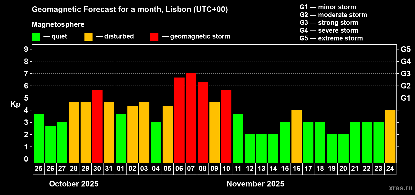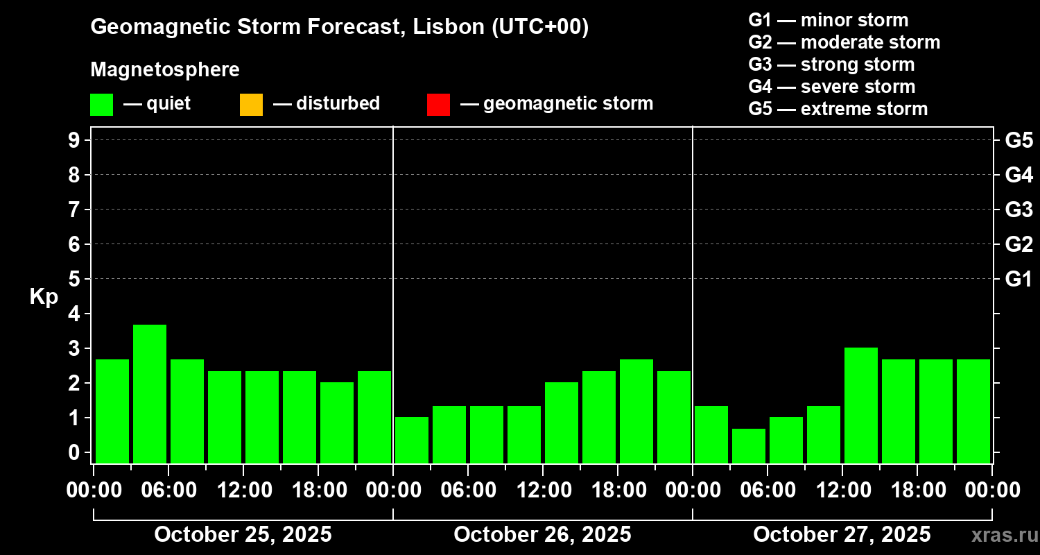 Geomagnetic storm forecast in Lisbon for Oct 25, 2025