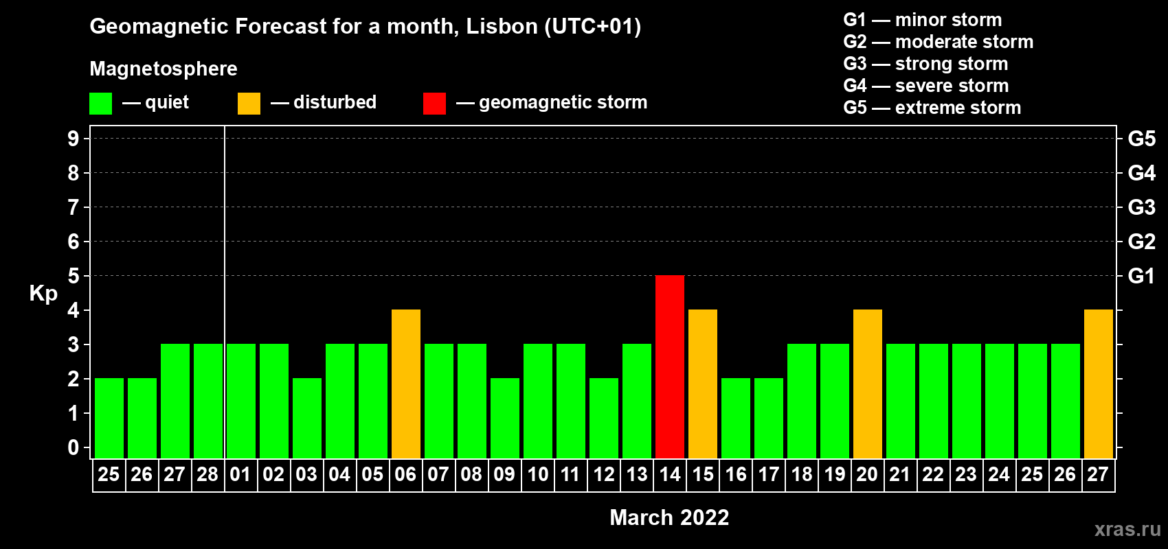 Geomagnetic storm forecast in Lisbon for Feb 25, 2022