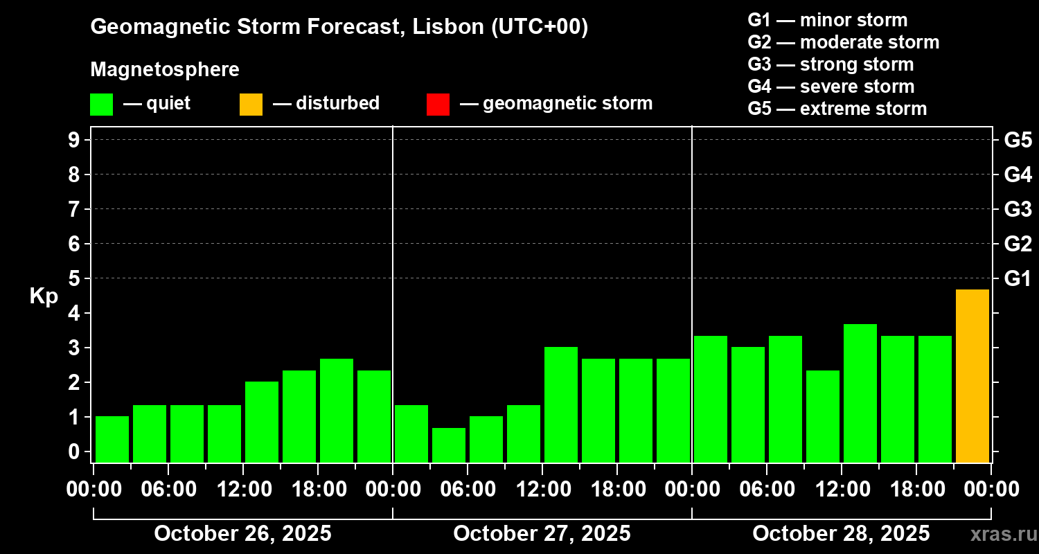 Geomagnetic storm forecast in Lisbon for Oct 26, 2025