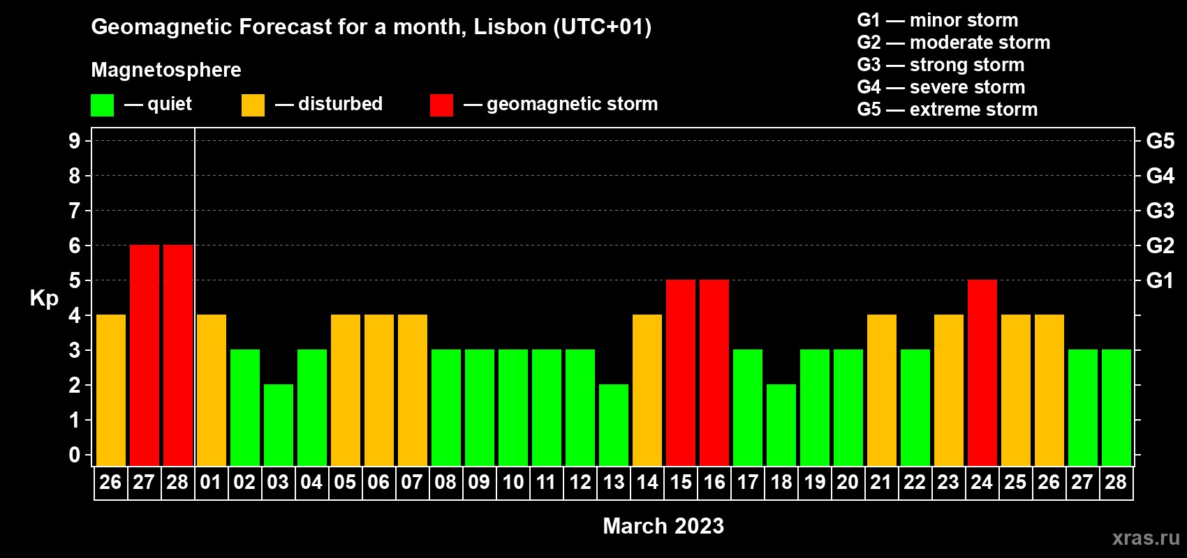 Geomagnetic storm forecast in Lisbon for Feb 26, 2023