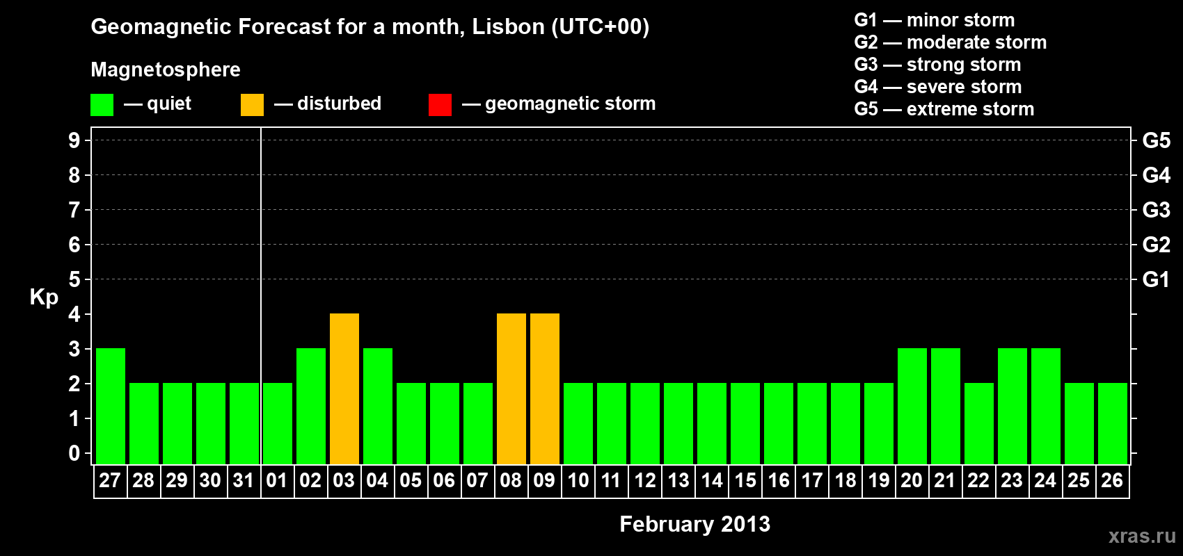 Geomagnetic storm forecast in Lisbon for Jan 27, 2013