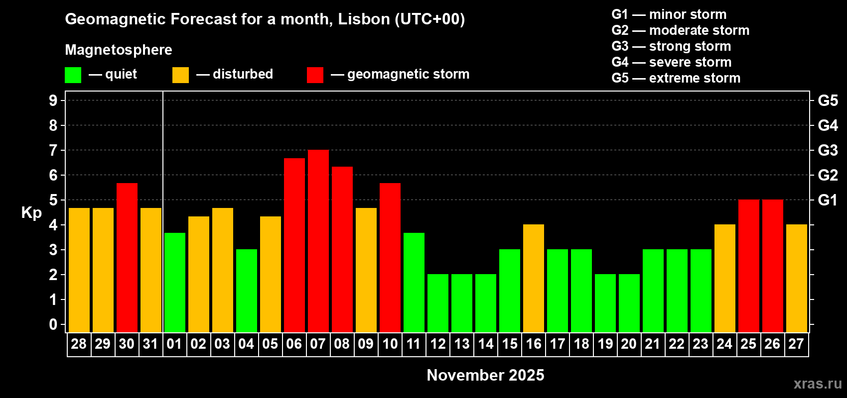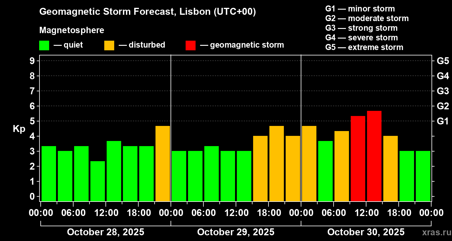 Geomagnetic storm forecast in Lisbon for Oct 28, 2025