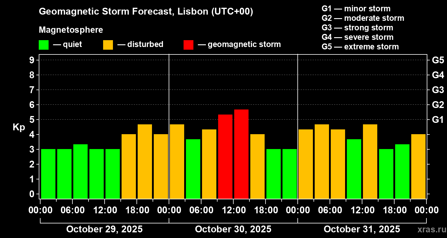 Geomagnetic storm forecast in Lisbon for Oct 29, 2025