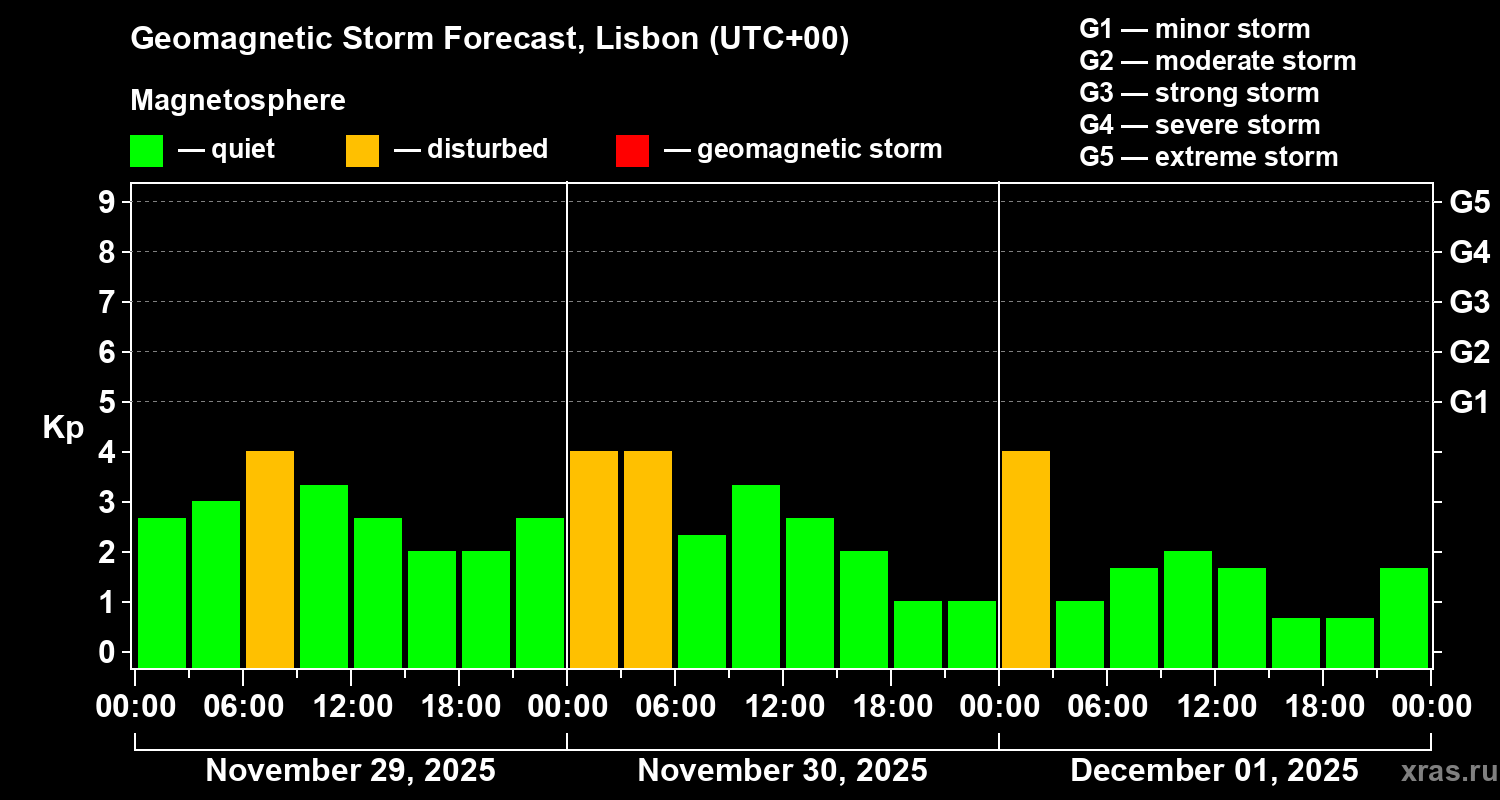 Geomagnetic storm forecast in Lisbon for Nov 29, 2025