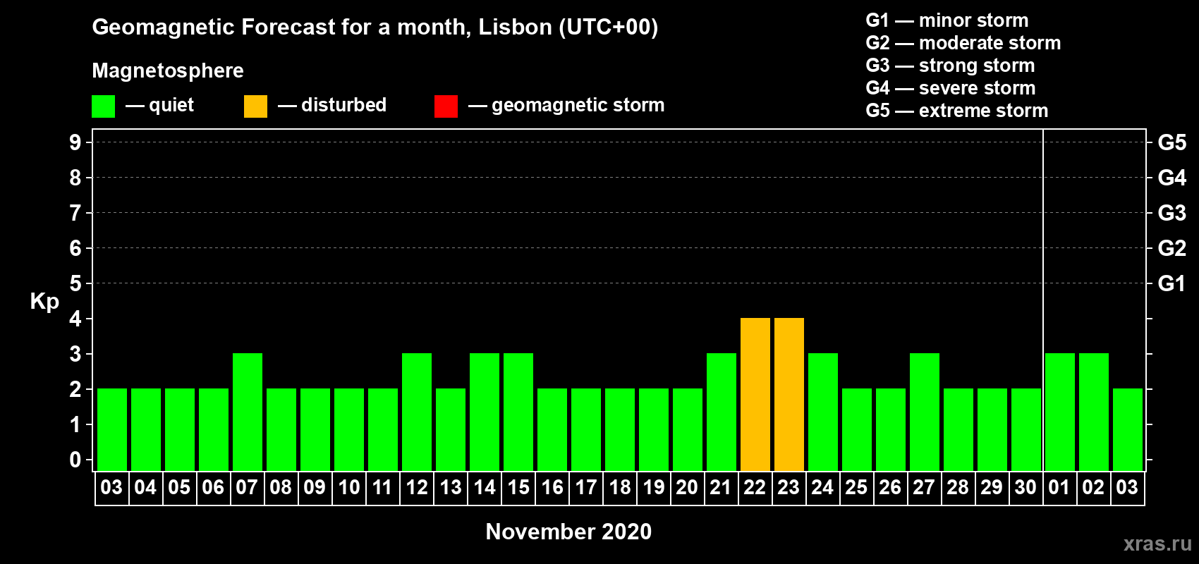 Geomagnetic storm forecast in Lisbon for Nov 03, 2020
