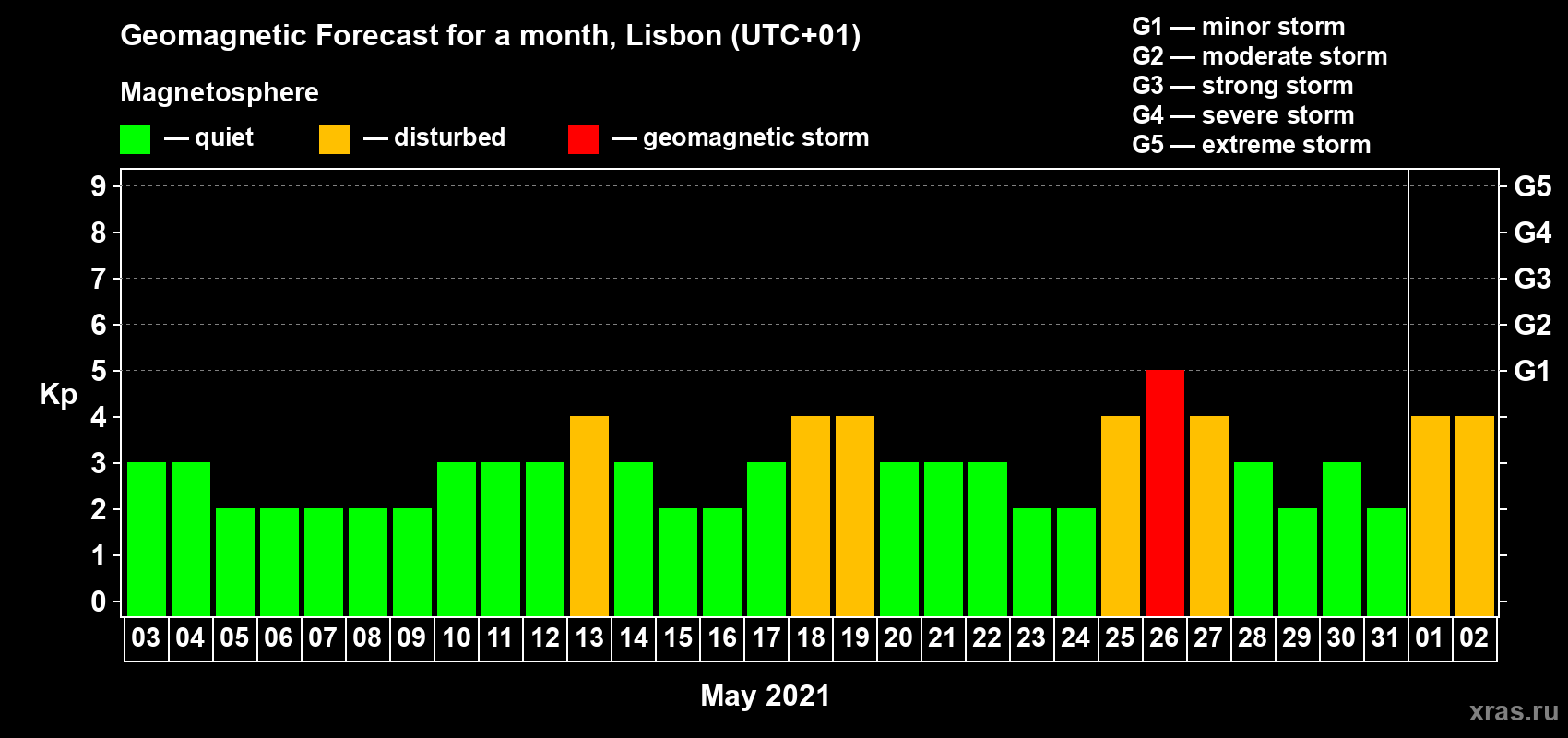 Geomagnetic storm forecast in Lisbon for May 03, 2021