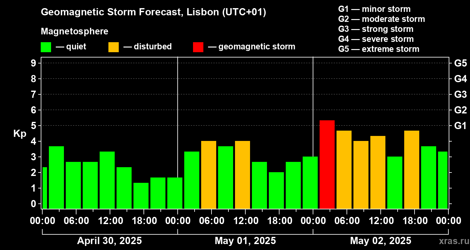 Geomagnetic storm forecast in Lisbon for Apr 30, 2025