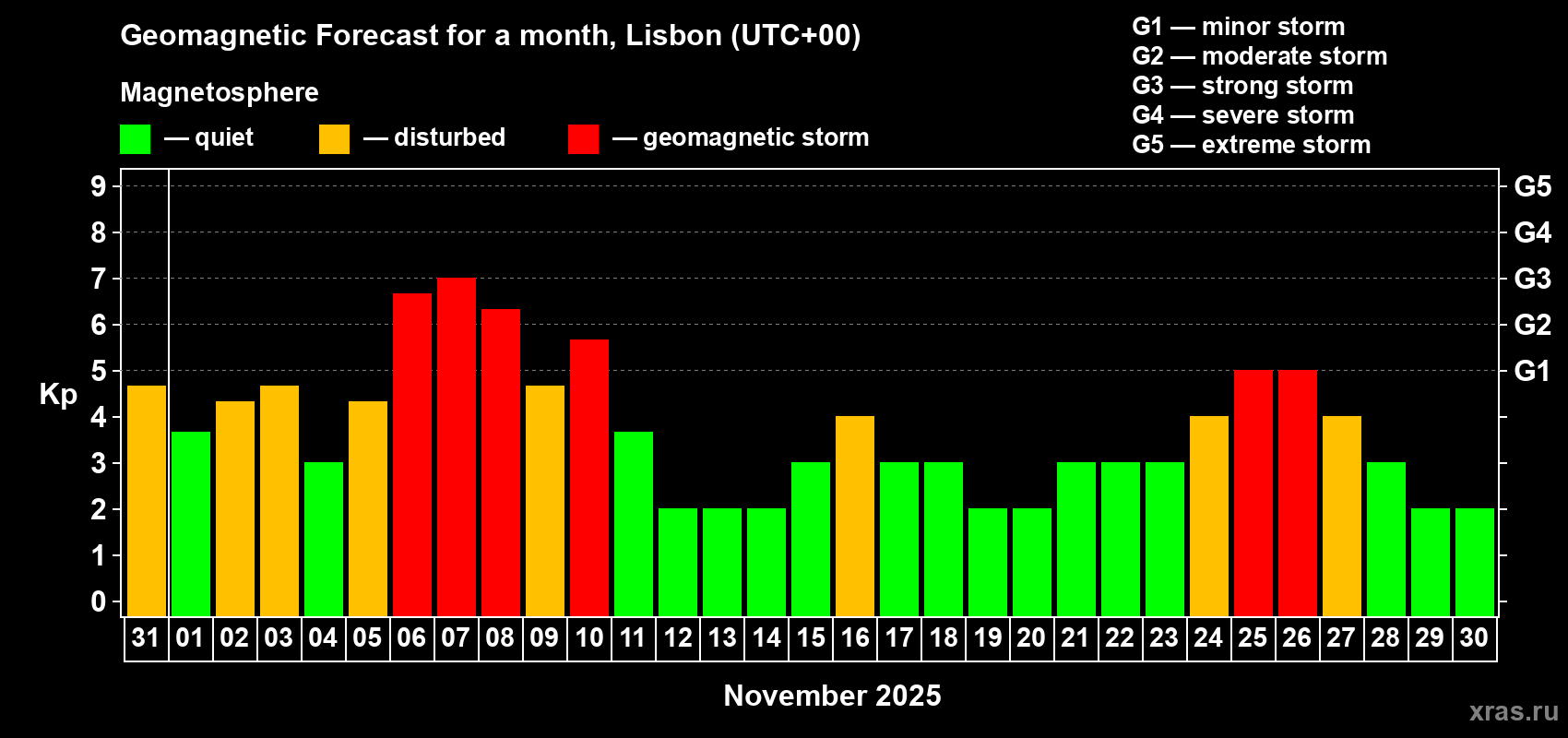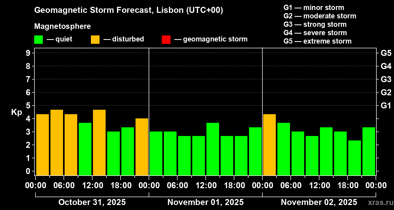 Geomagnetic storm forecast in Lisbon for Oct 31, 2025