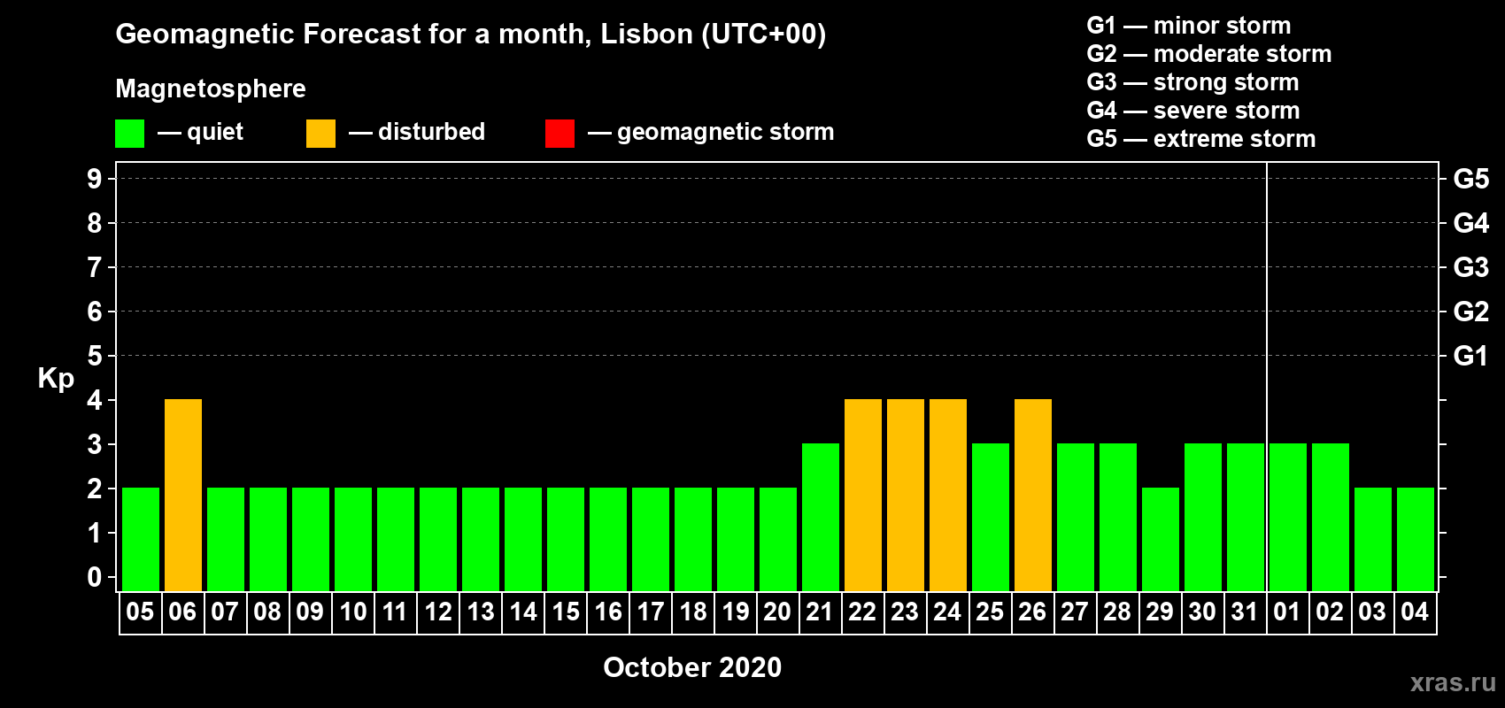 Geomagnetic storm forecast in Lisbon for Oct 05, 2020