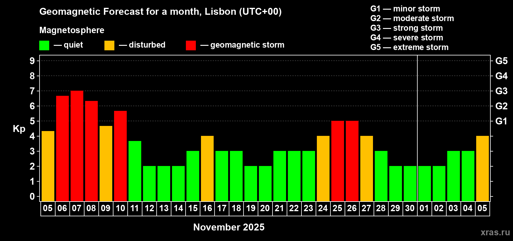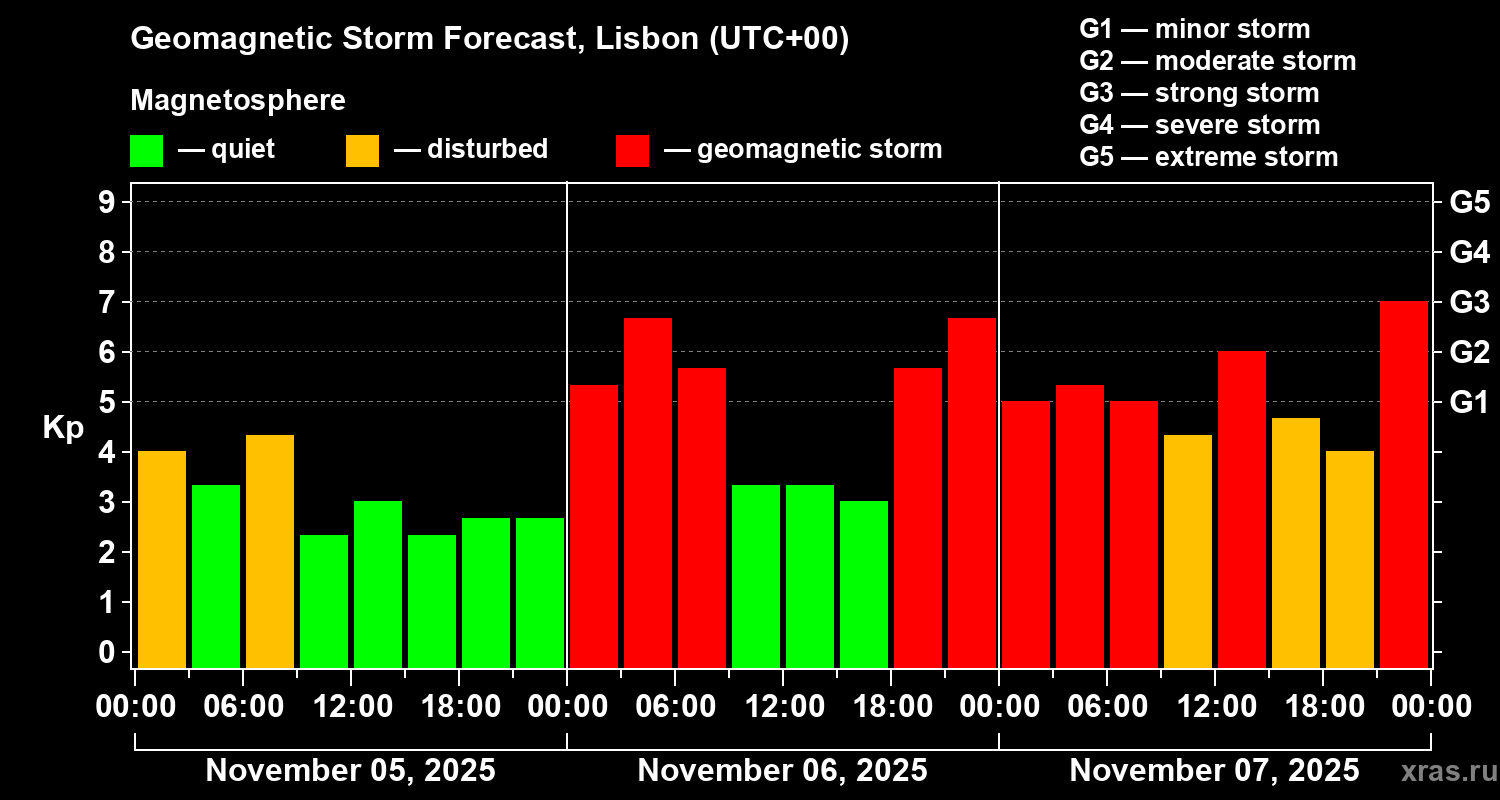Geomagnetic storm forecast in Lisbon for Nov 05, 2025