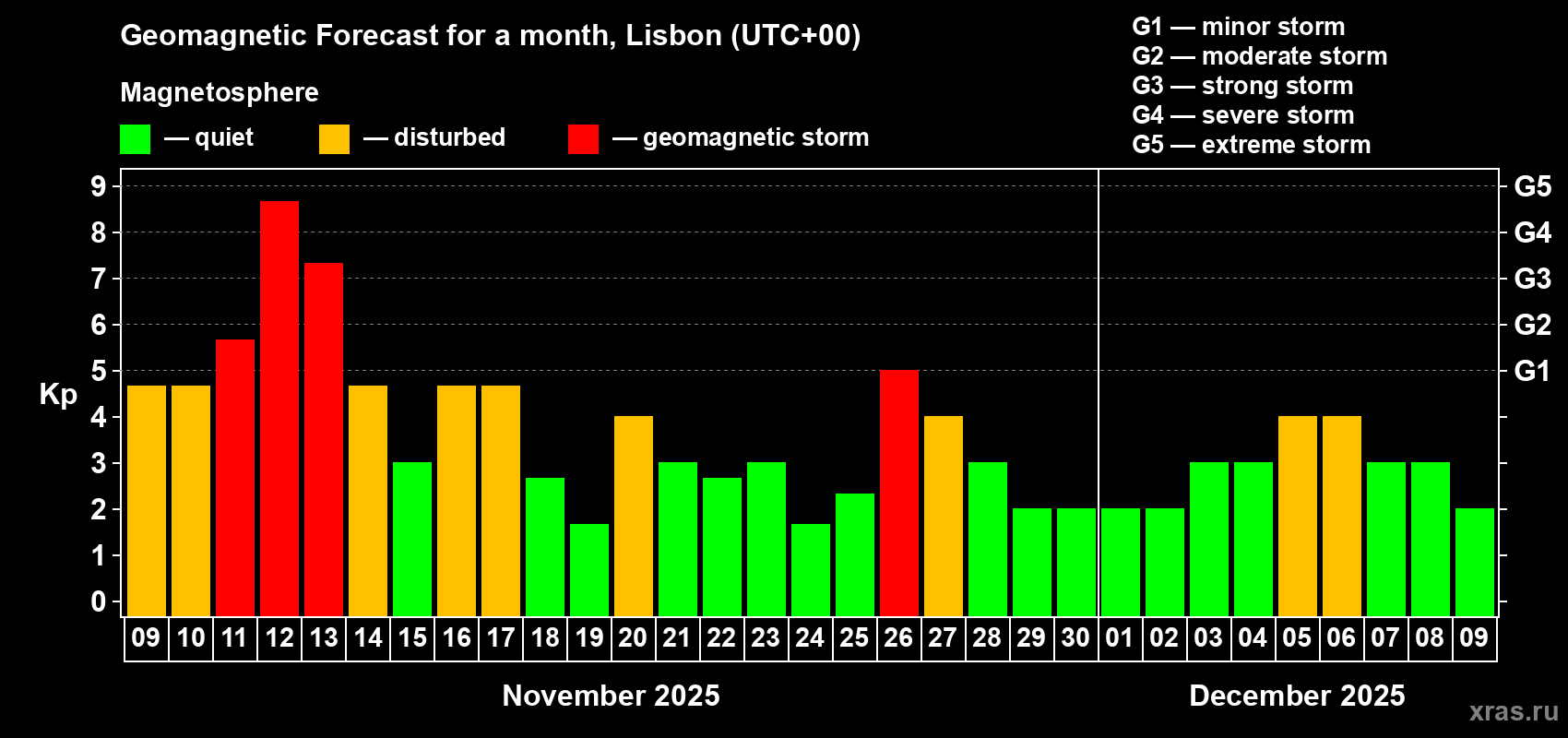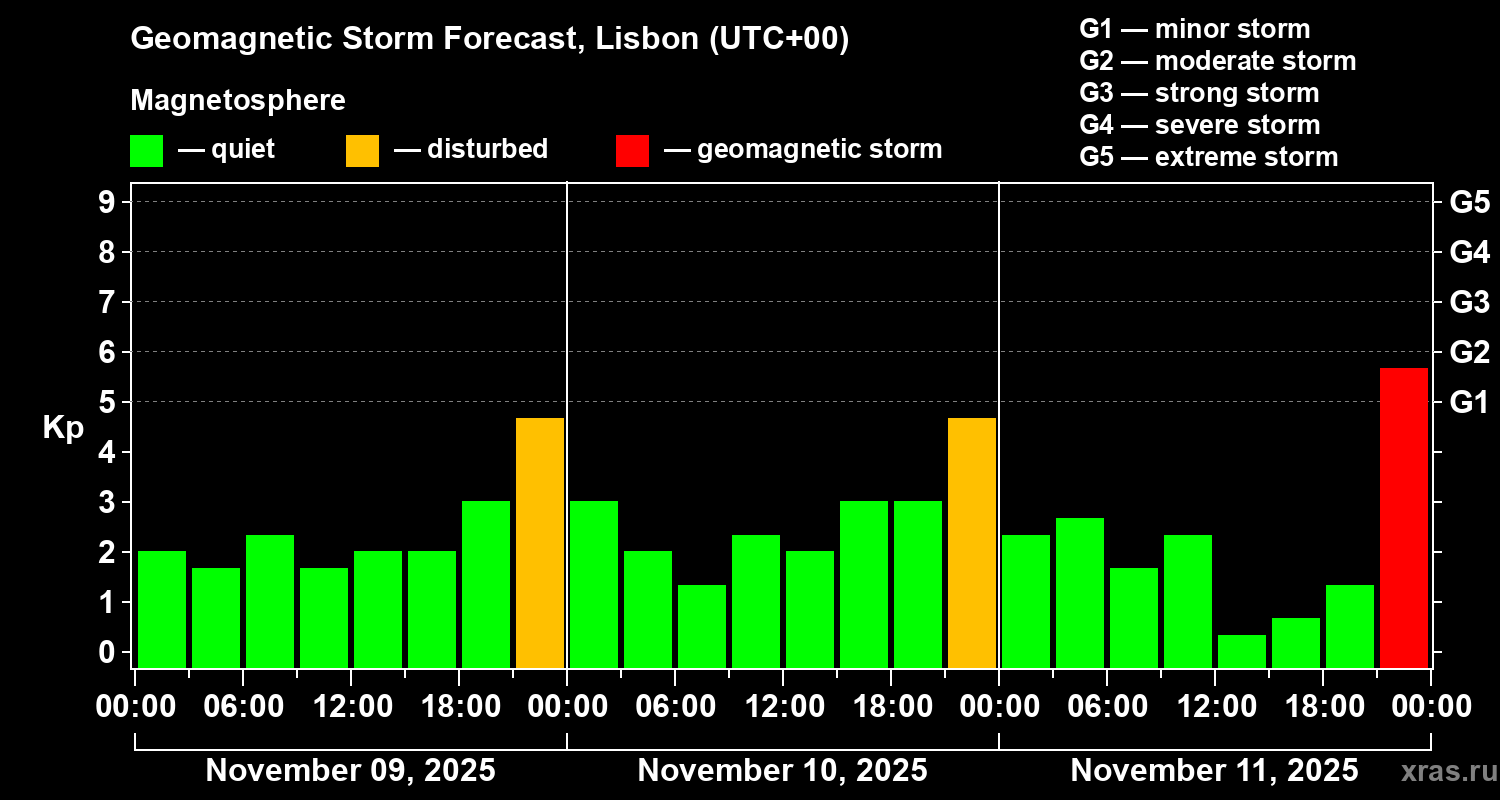 Geomagnetic storm forecast in Lisbon for Nov 09, 2025