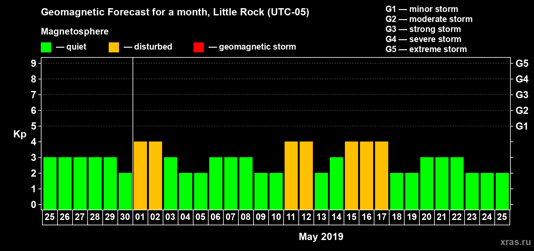 Geomagnetic storm forecast in Little Rock for Apr 25, 2019