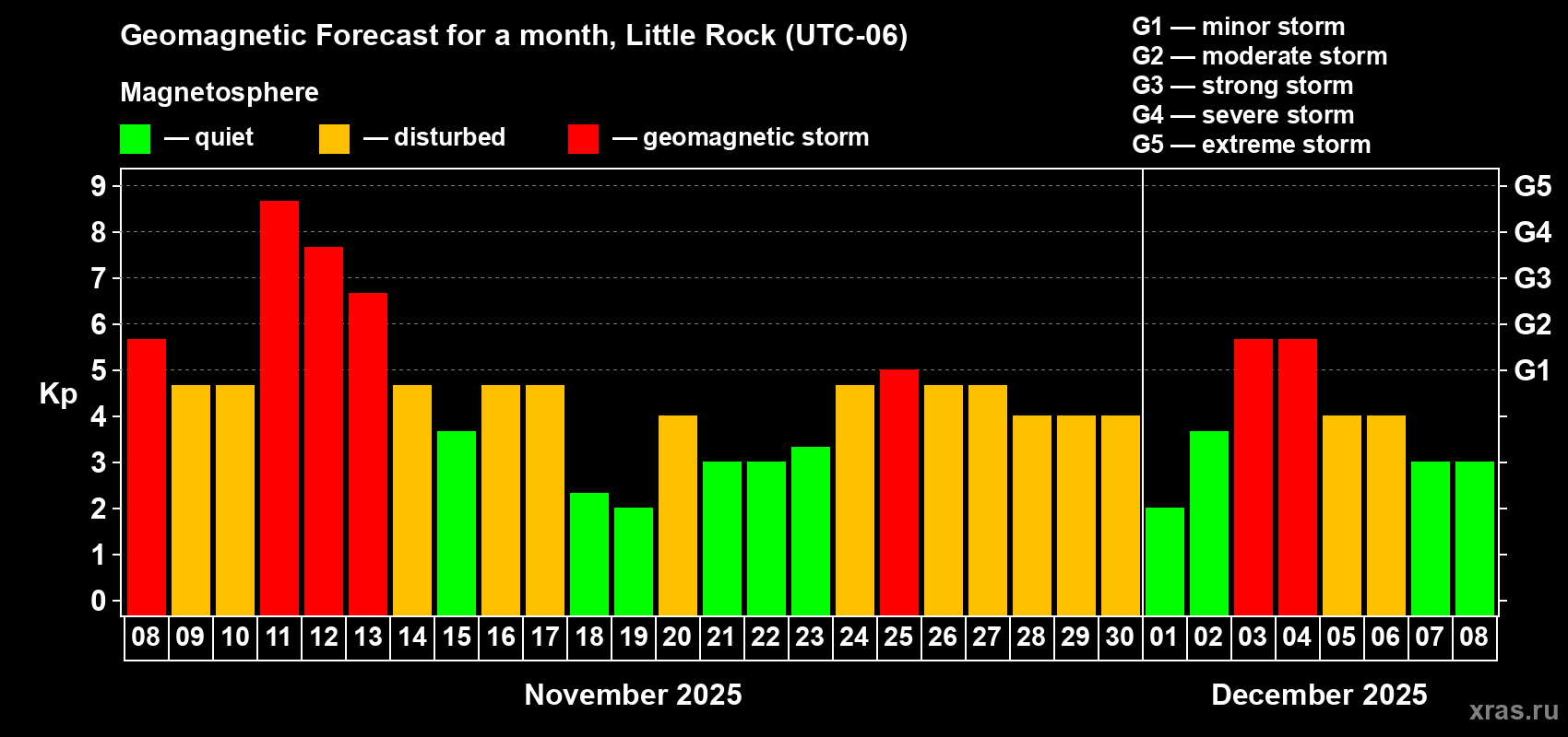 Geomagnetic storm forecast in Little Rock for Nov 08, 2025
