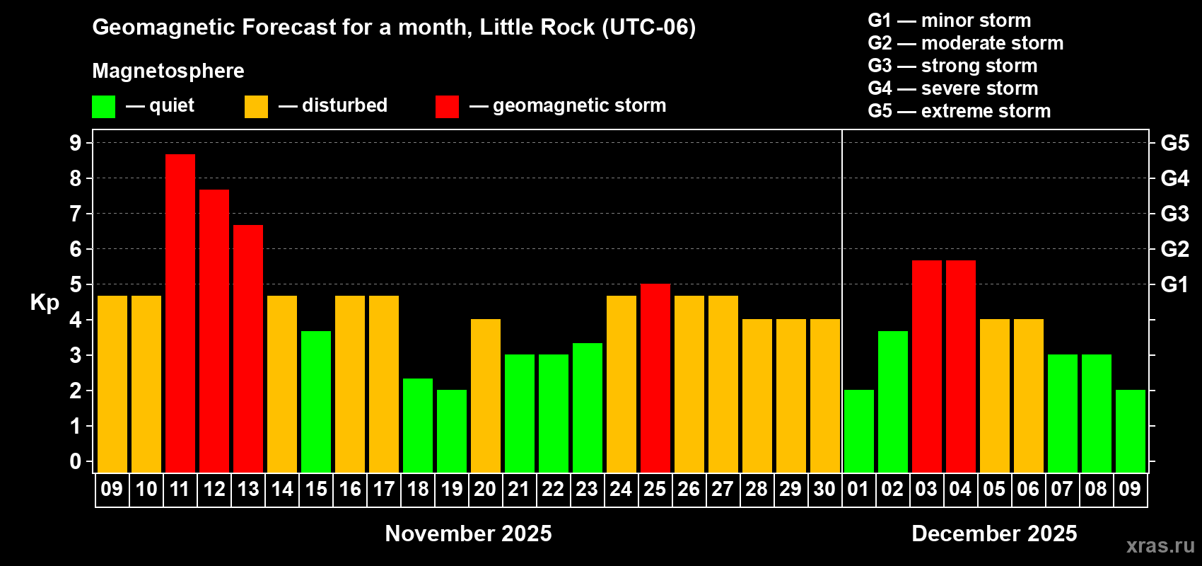 Geomagnetic storm forecast in Little Rock for Nov 09, 2025
