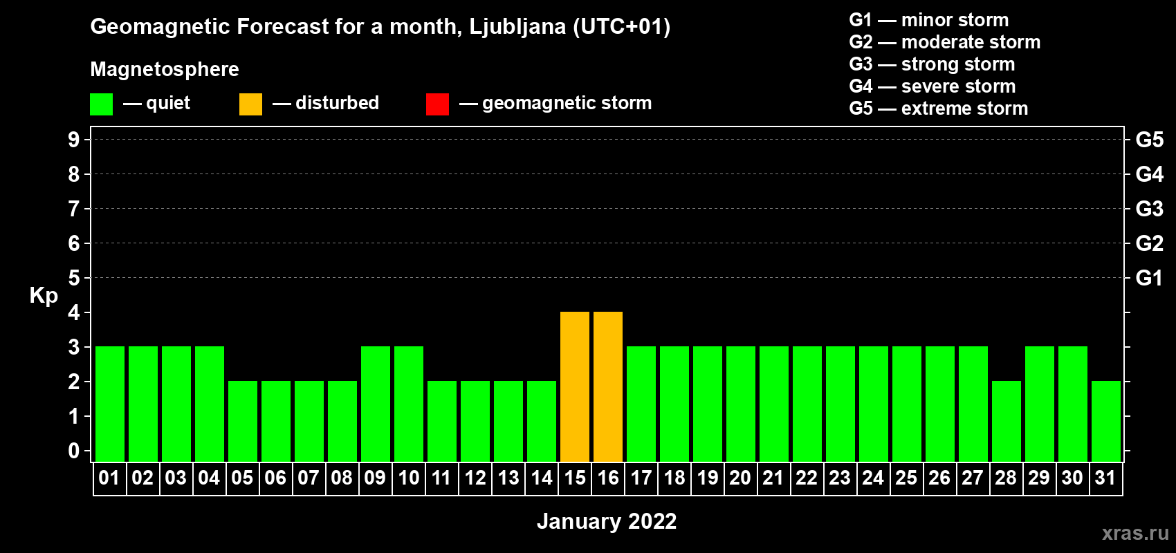 Geomagnetic storm forecast in Ljubljana for Jan 01, 2022