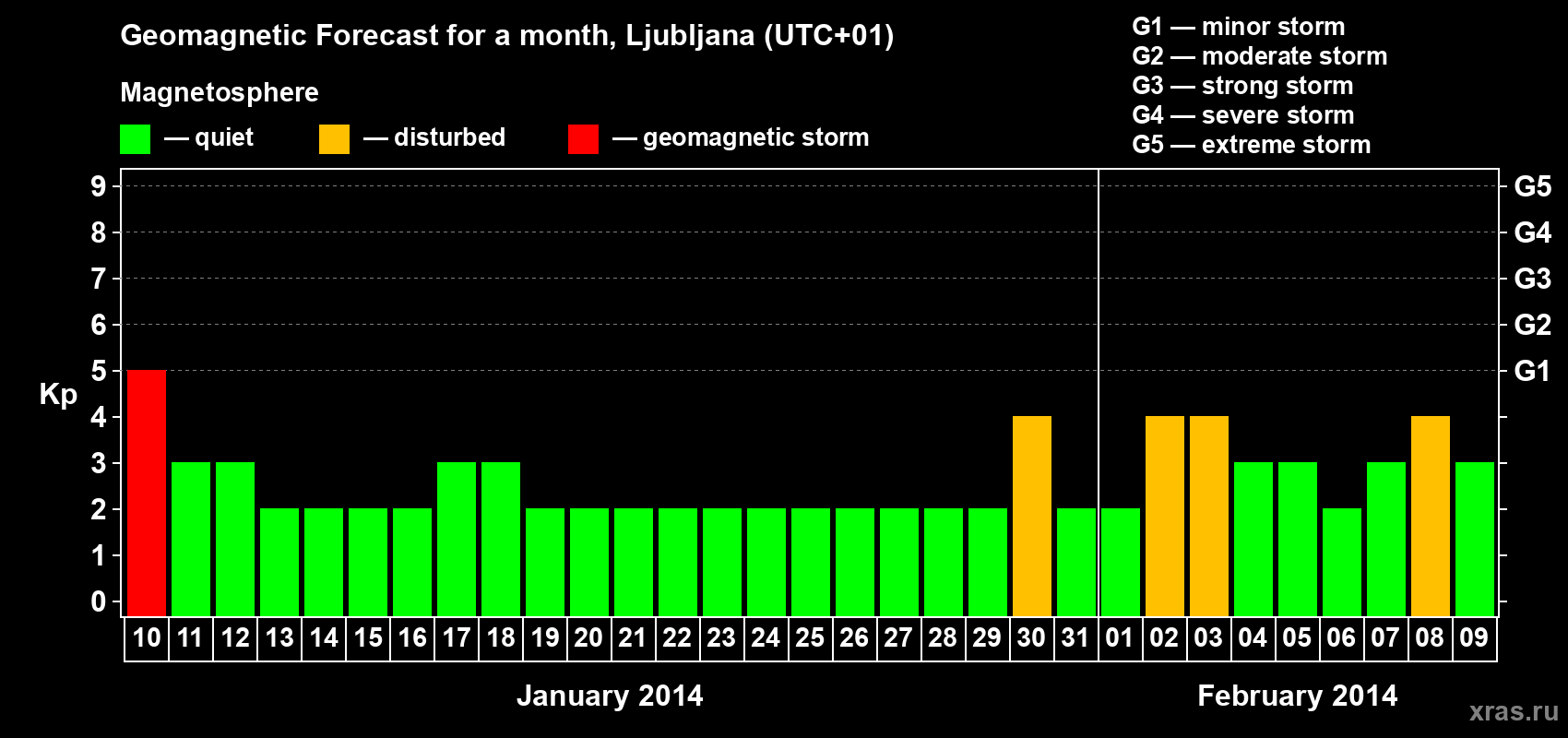 Geomagnetic storm forecast in Ljubljana for Jan 10, 2014