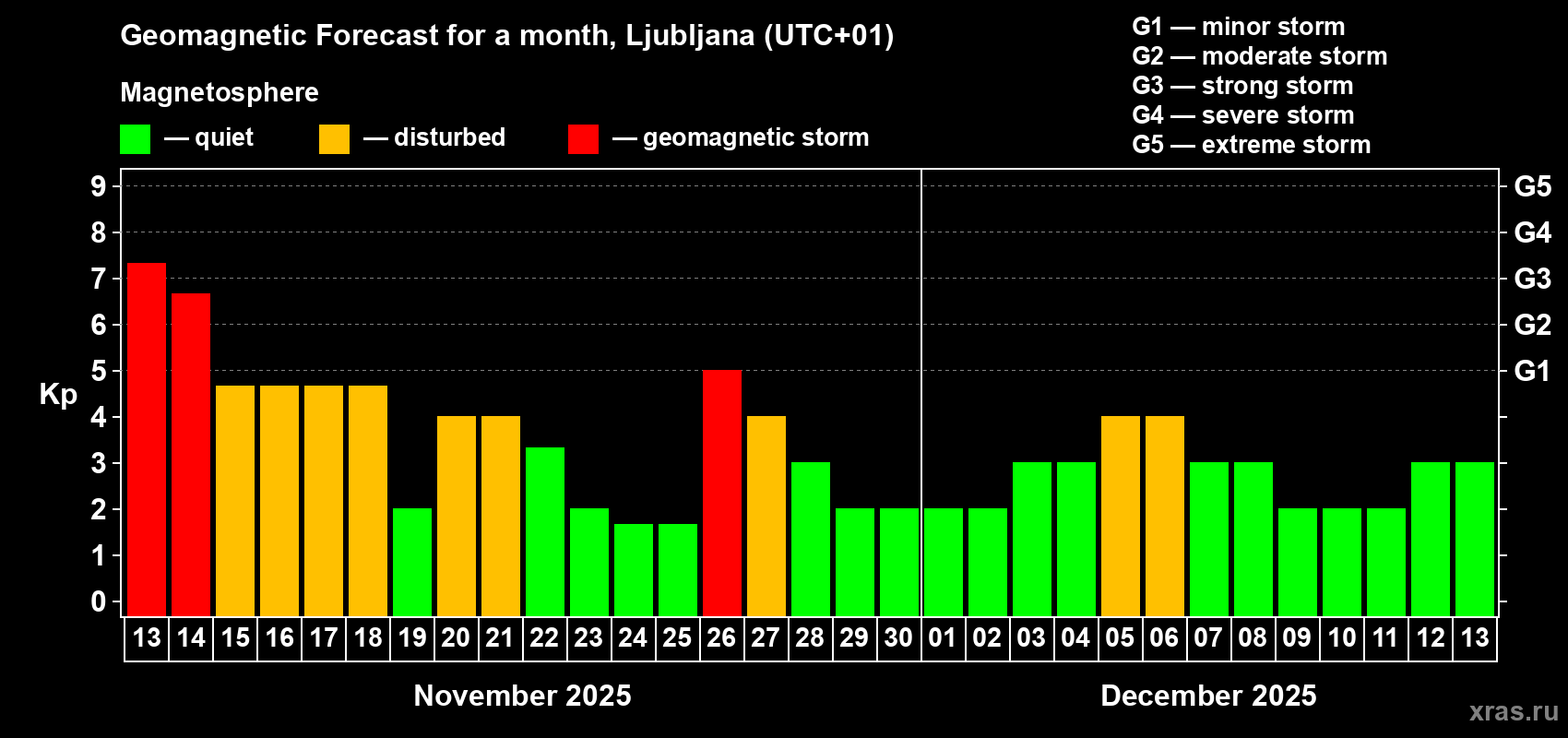 Geomagnetic storm forecast in Ljubljana for Nov 13, 2025