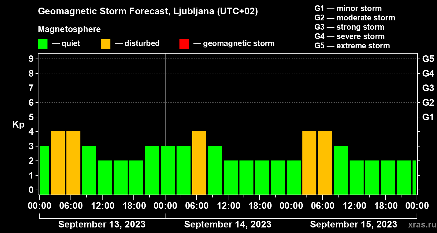 Geomagnetic storm forecast in Ljubljana for Sep 13, 2023