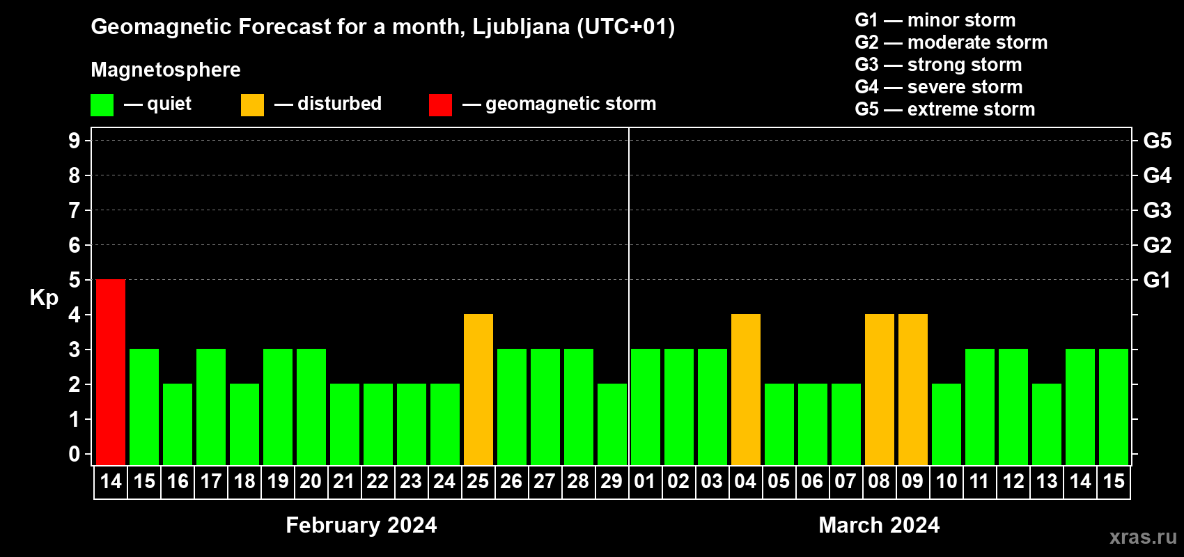 Geomagnetic storm forecast in Ljubljana for Feb 14, 2024