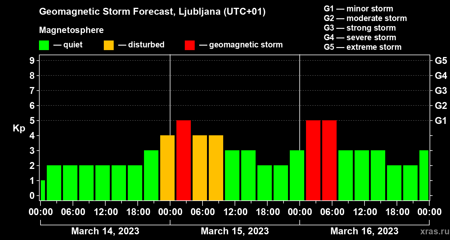 Geomagnetic storm forecast in Ljubljana for Mar 14, 2023