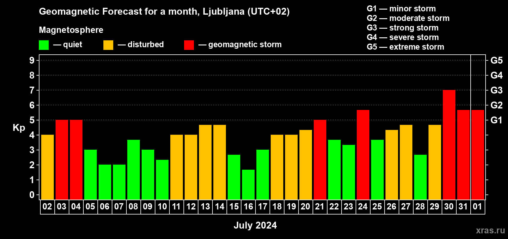 Geomagnetic storm forecast in Ljubljana for Jul 02, 2024