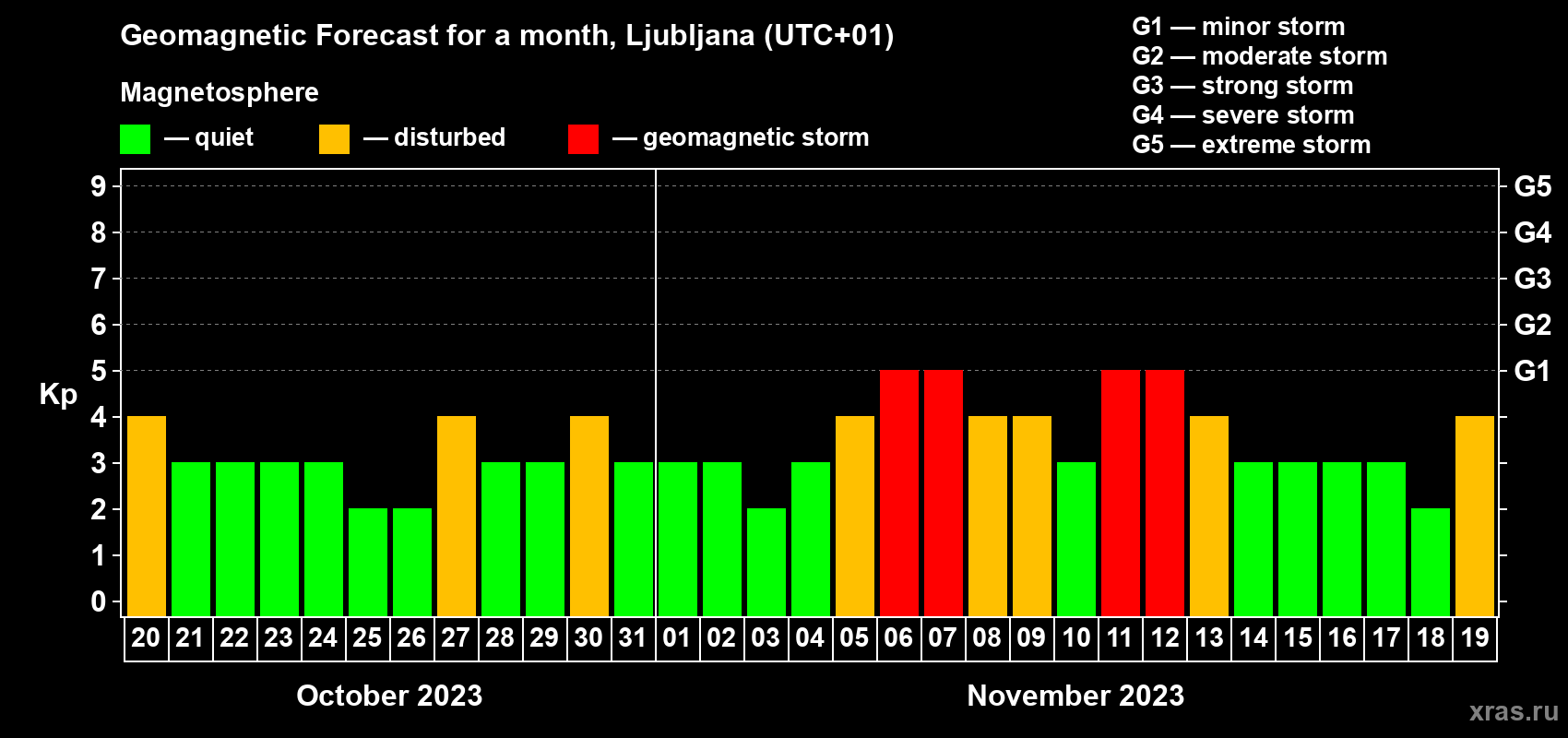 Geomagnetic storm forecast in Ljubljana for Oct 20, 2023