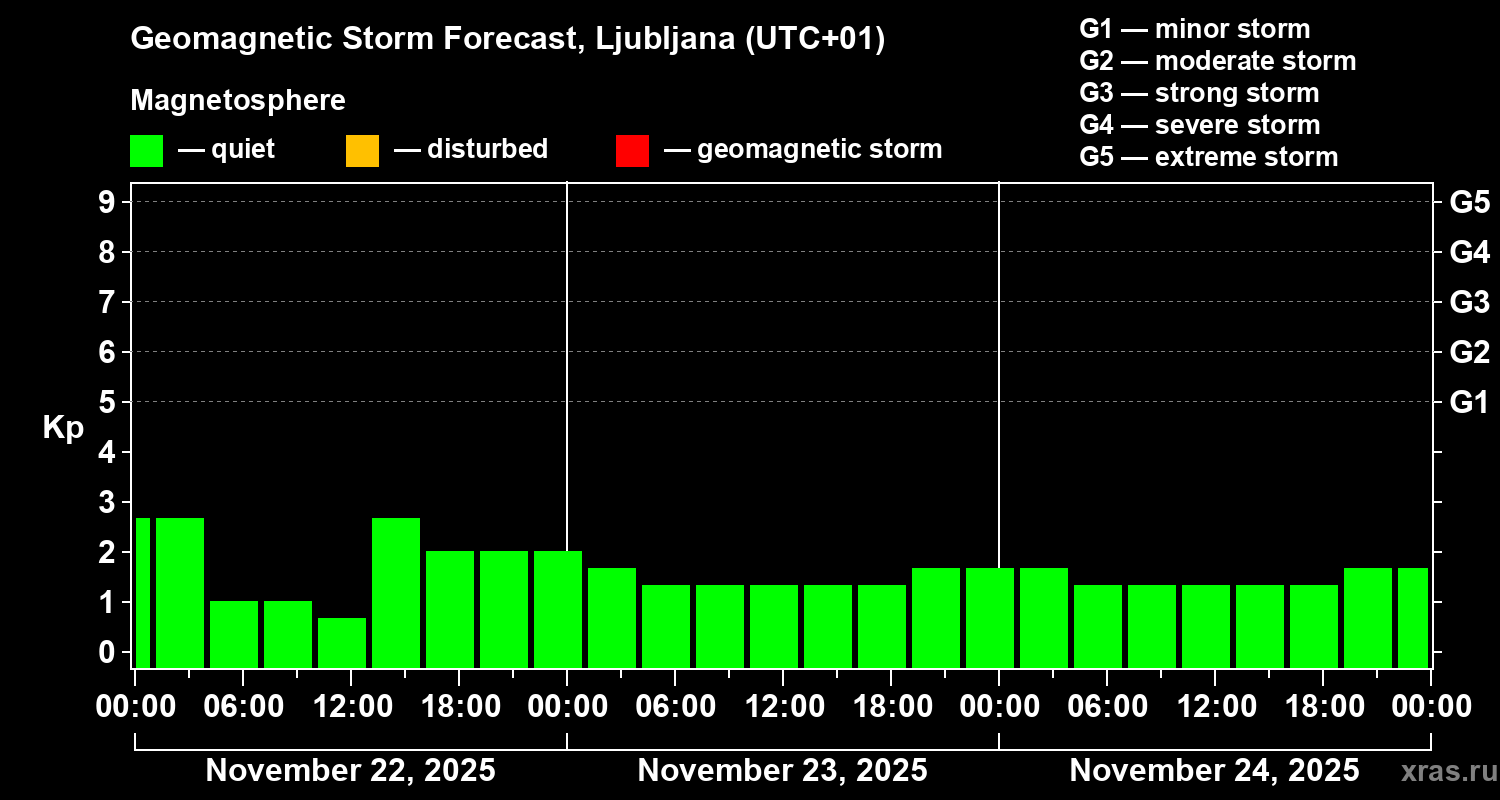Geomagnetic storm forecast in Ljubljana for Nov 22, 2025