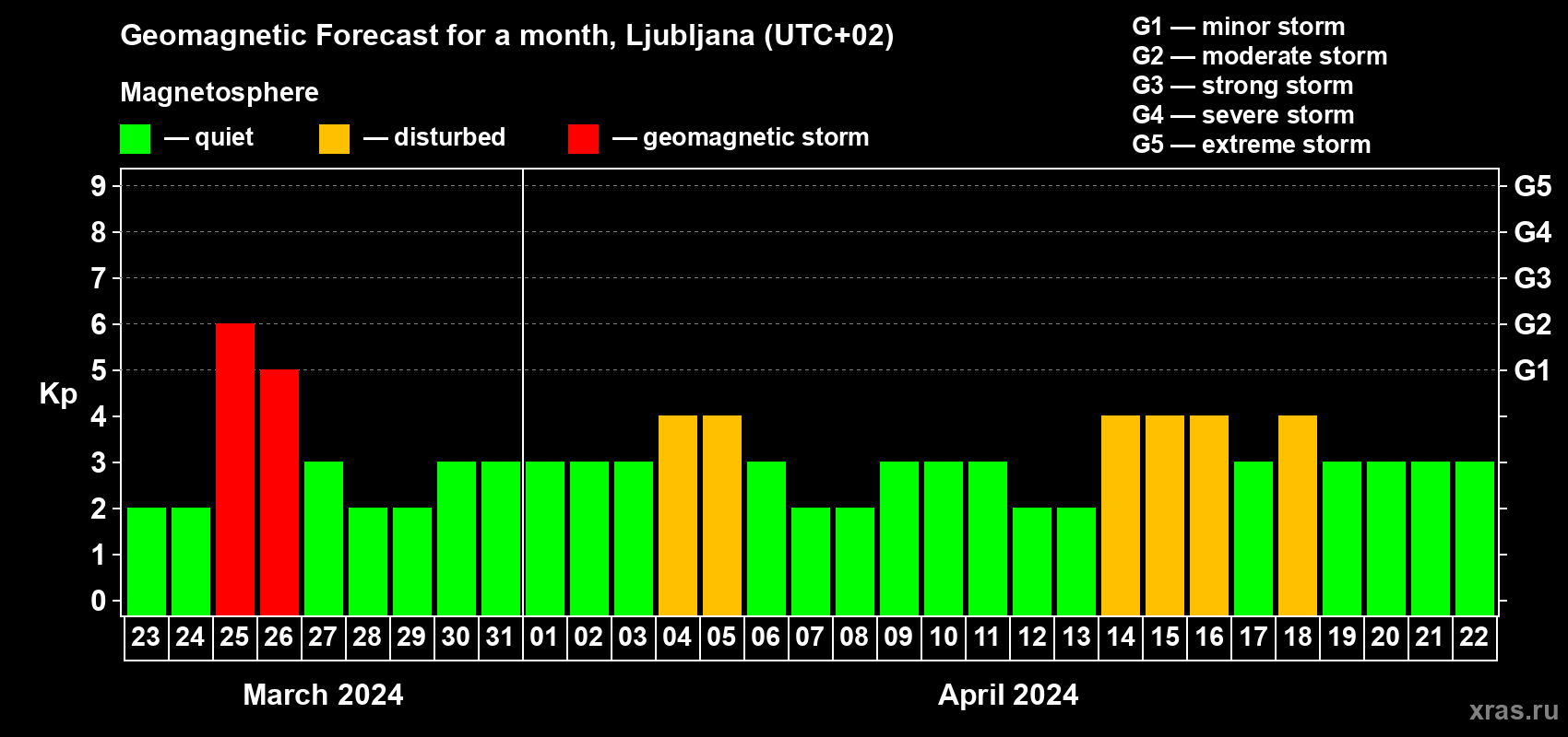 Geomagnetic storm forecast in Ljubljana for Mar 23, 2024