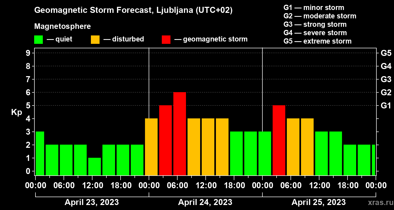 Geomagnetic storm forecast in Ljubljana for Apr 23, 2023