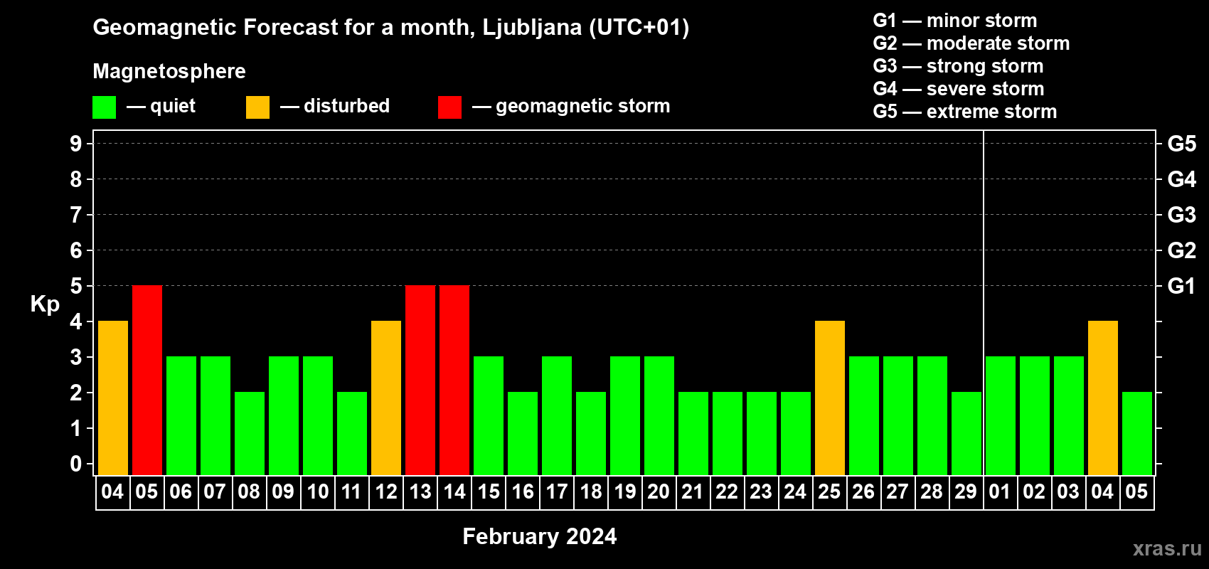 Geomagnetic storm forecast in Ljubljana for Feb 04, 2024
