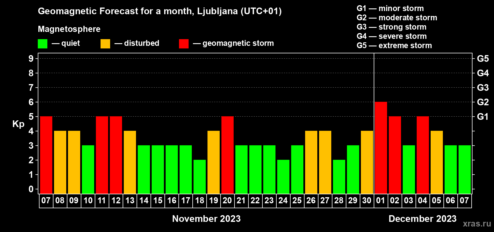 Geomagnetic storm forecast in Ljubljana for Nov 07, 2023