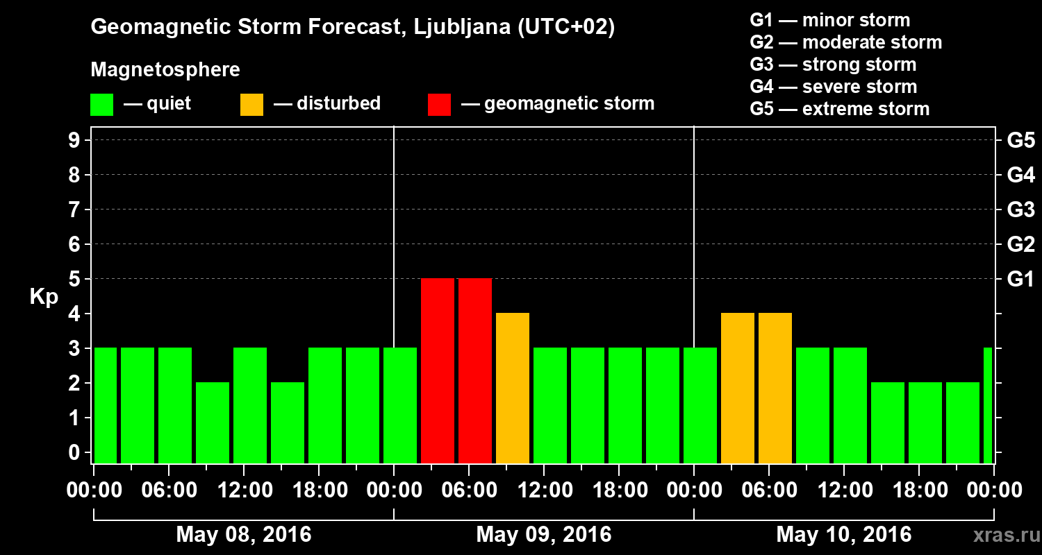 Geomagnetic storm forecast in Ljubljana for May 08, 2016