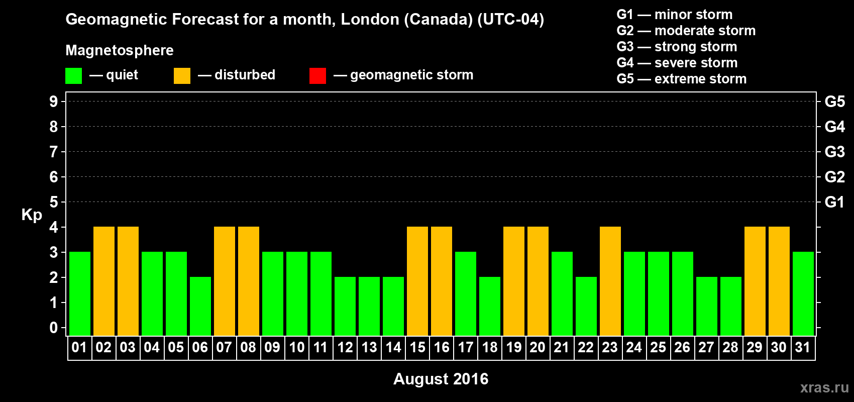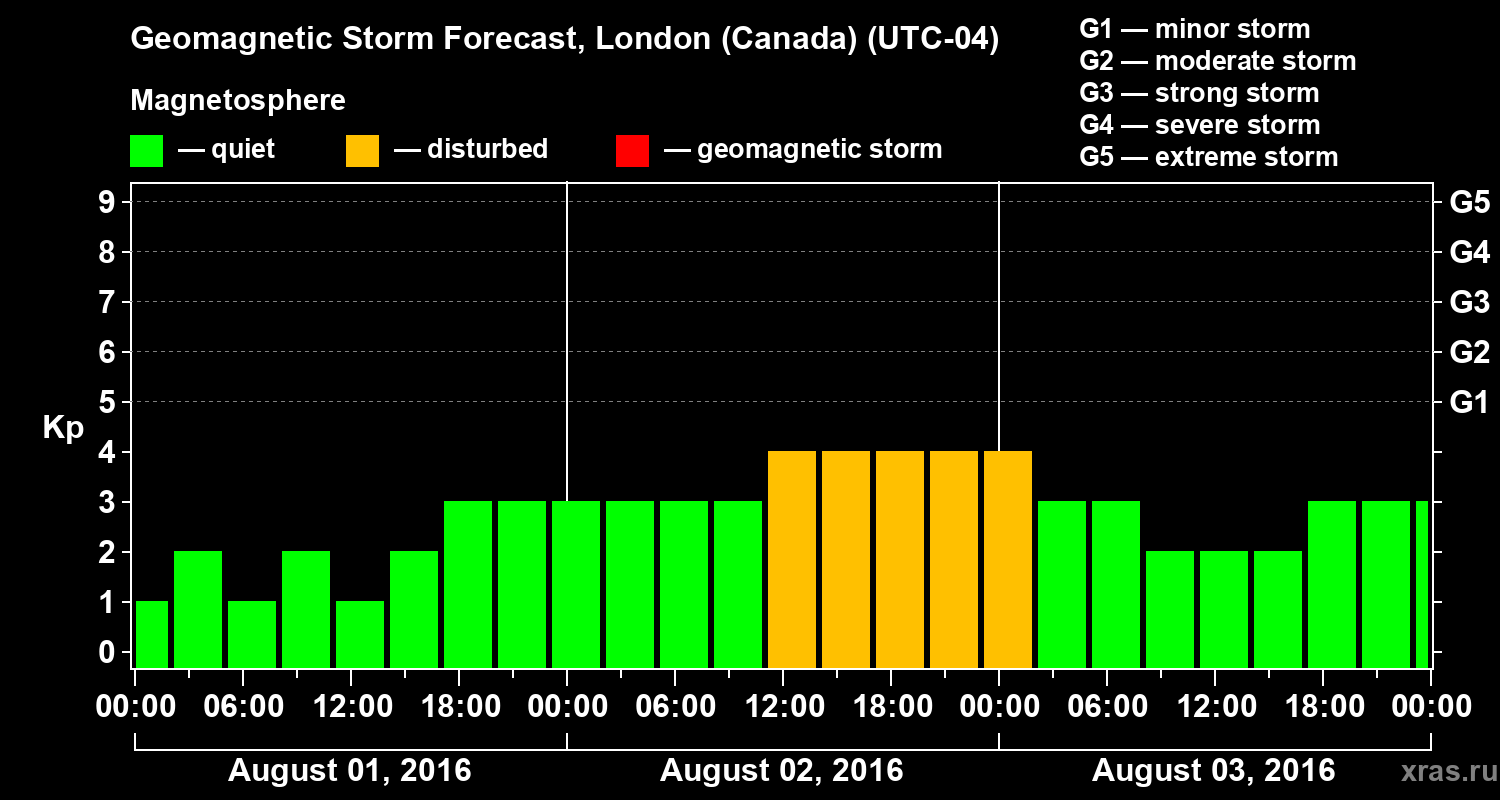 Geomagnetic storm forecast in London (Canada) for Aug 01, 2016