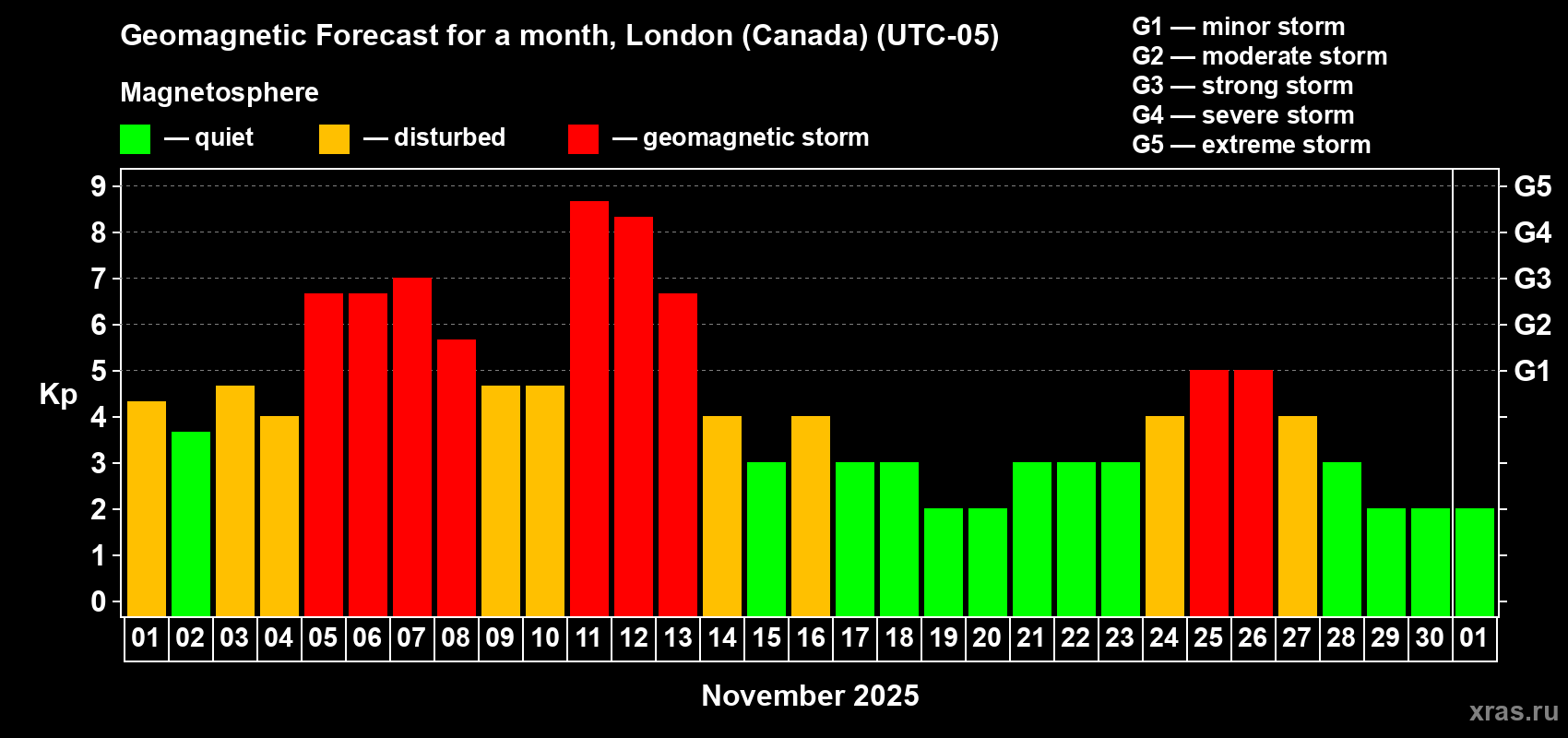 Geomagnetic storm forecast in London (Canada) for Nov 01, 2025