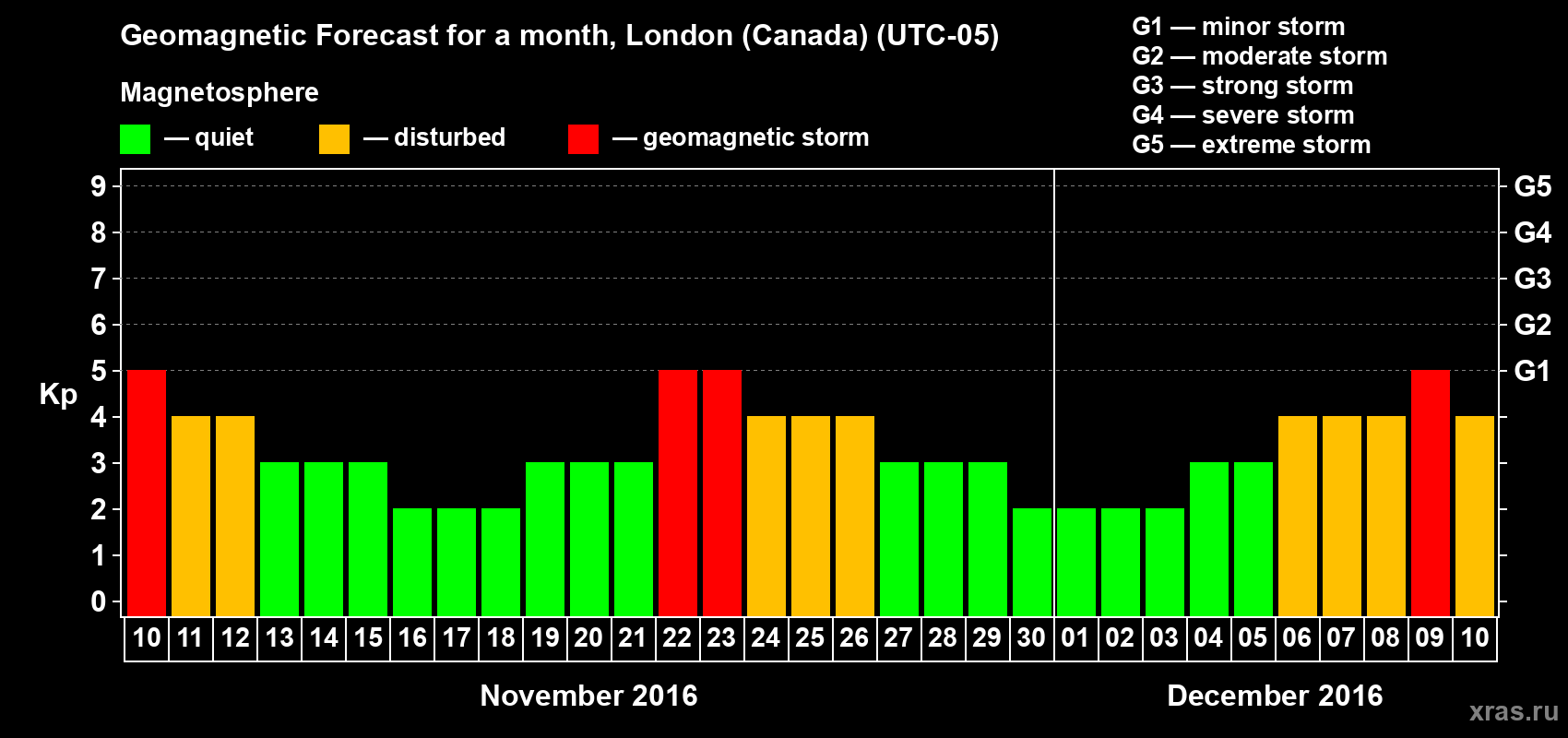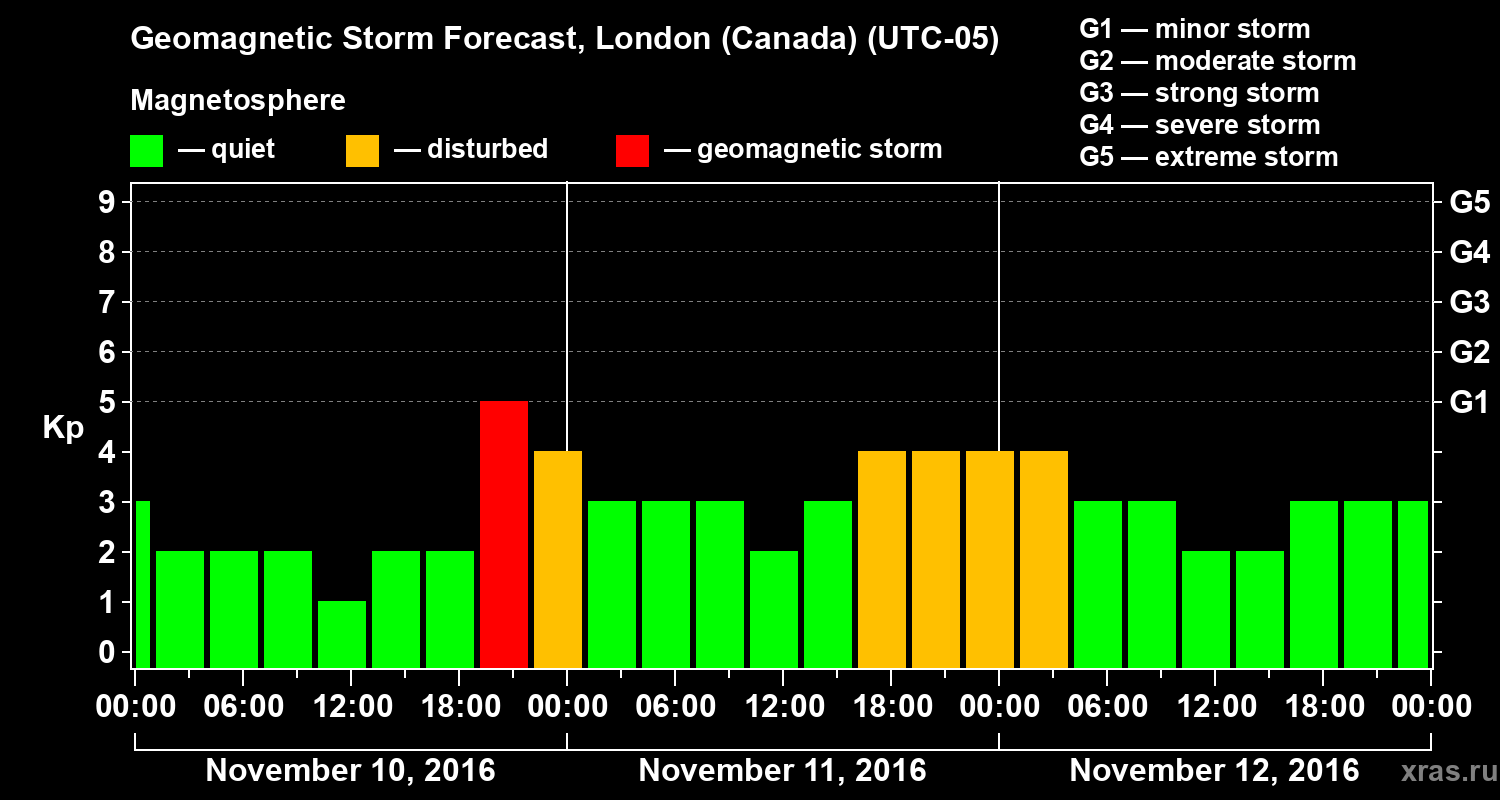 Geomagnetic storm forecast in London (Canada) for Nov 10, 2016
