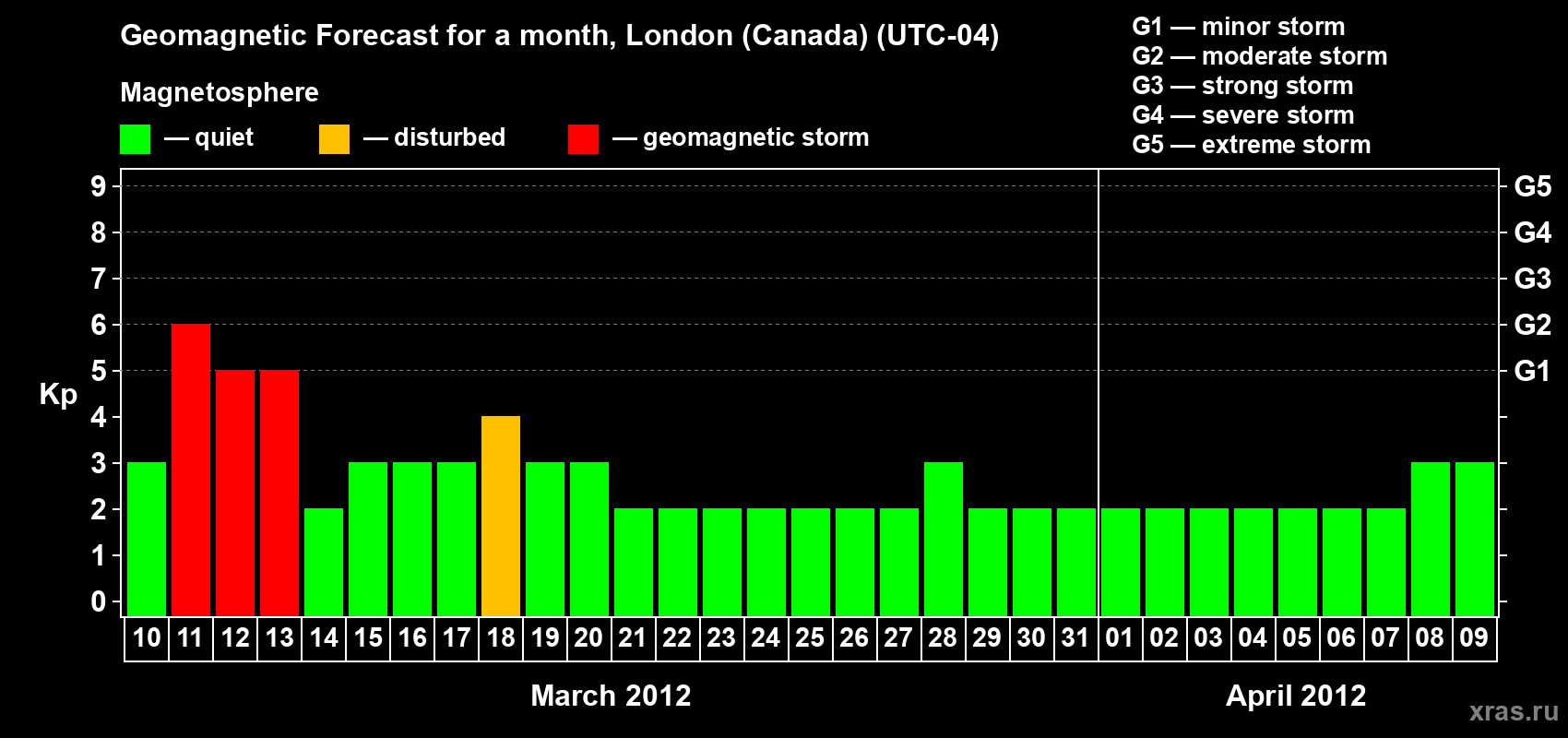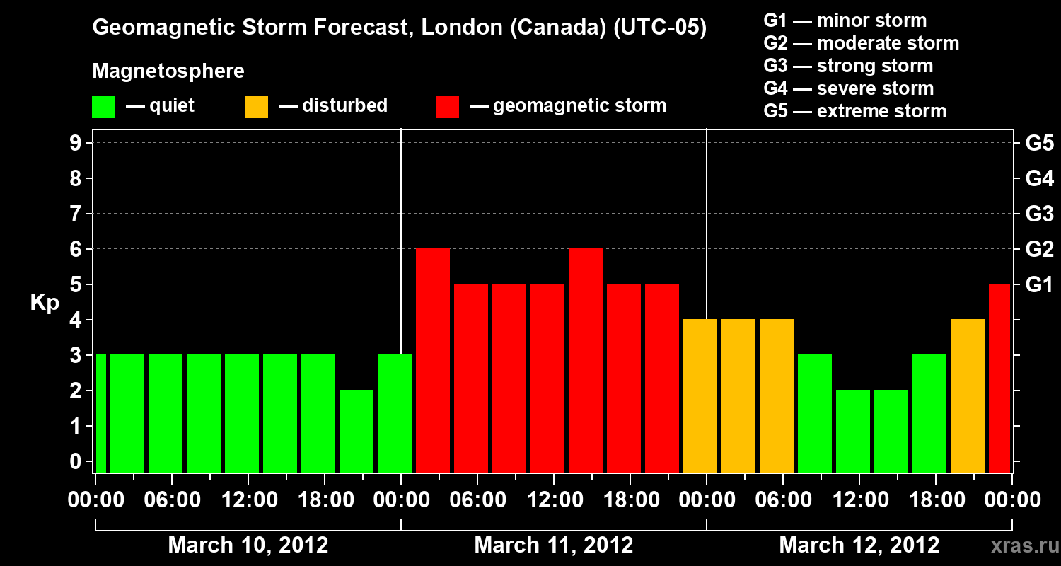 Geomagnetic storm forecast in London (Canada) for Mar 10, 2012