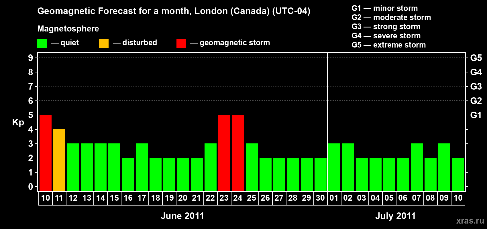 Geomagnetic storm forecast in London (Canada) for Jun 10, 2011