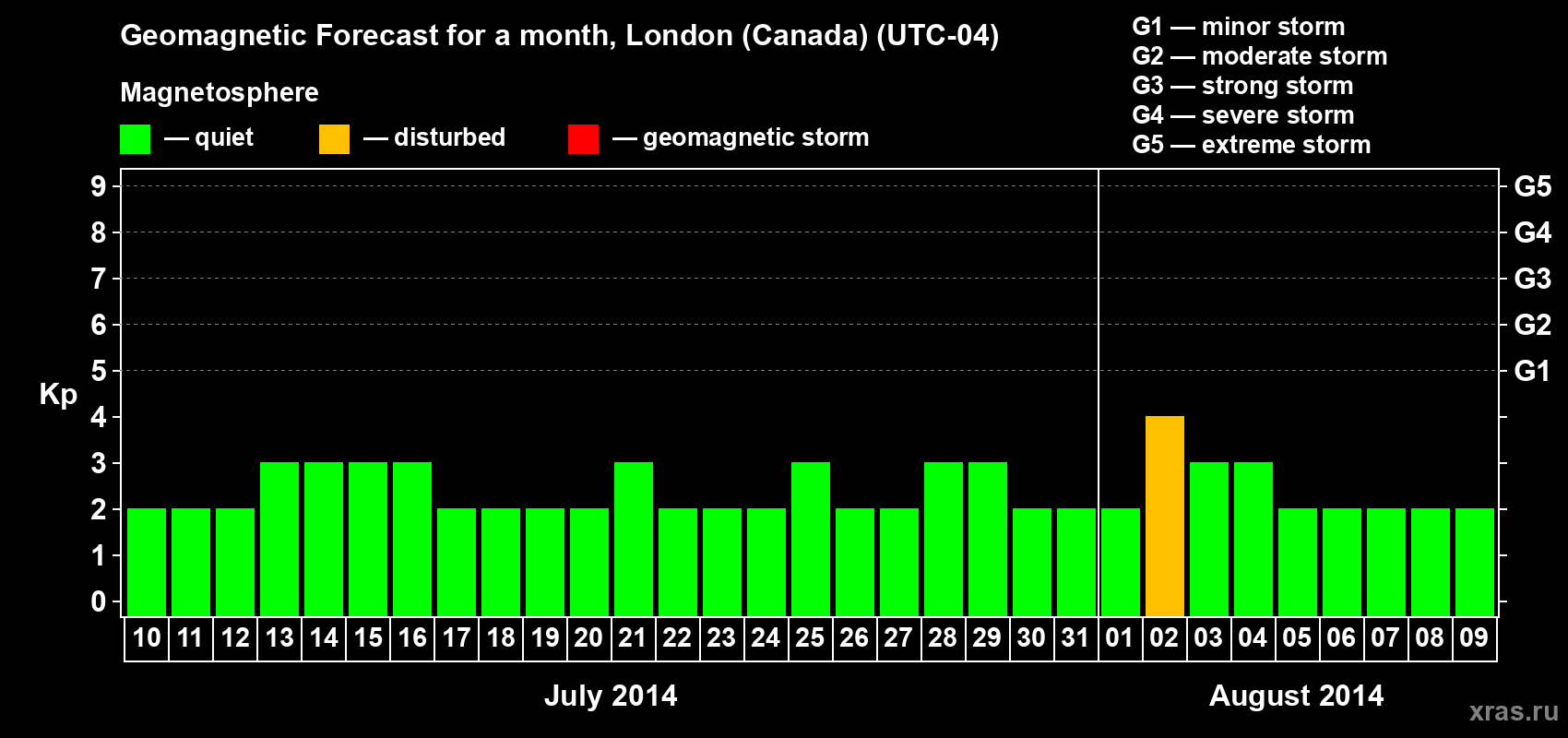 Geomagnetic storm forecast in London (Canada) for Jul 10, 2014