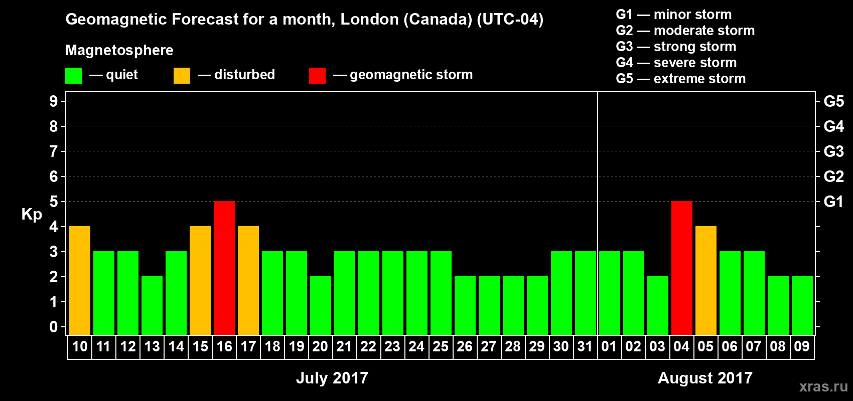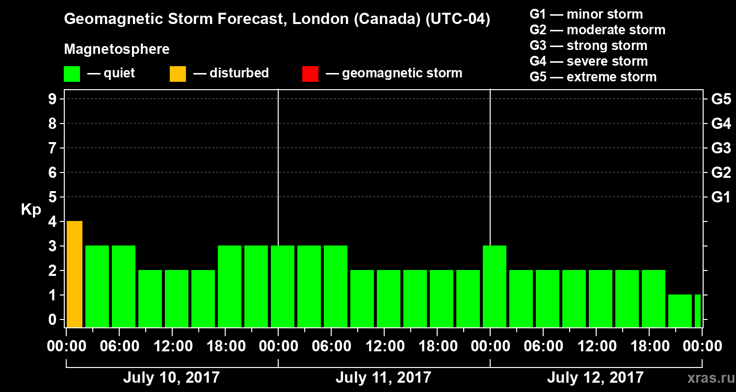 Geomagnetic storm forecast in London (Canada) for Jul 10, 2017