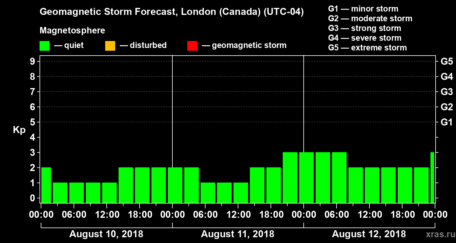 Geomagnetic storm forecast in London (Canada) for Aug 10, 2018