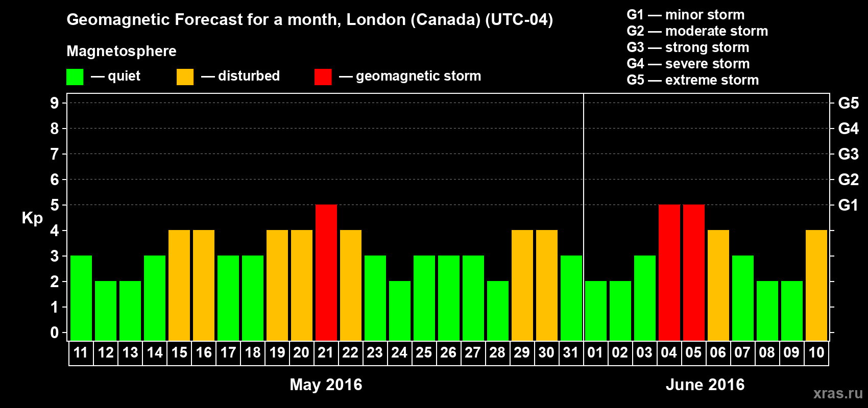 Geomagnetic storm forecast in London (Canada) for May 11, 2016