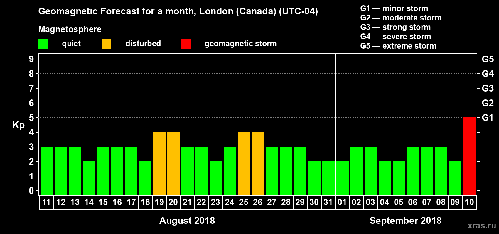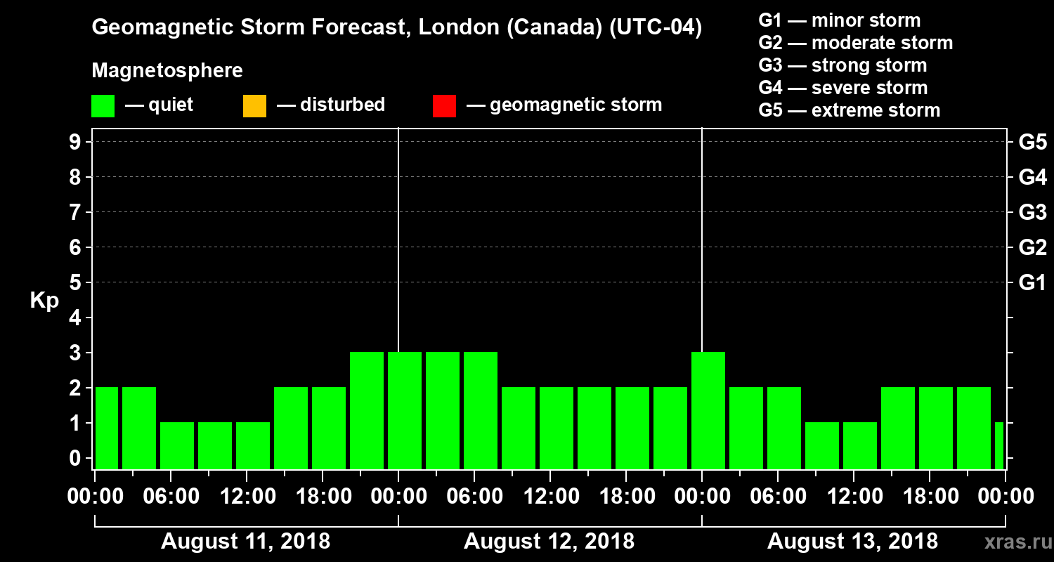 Geomagnetic storm forecast in London (Canada) for Aug 11, 2018