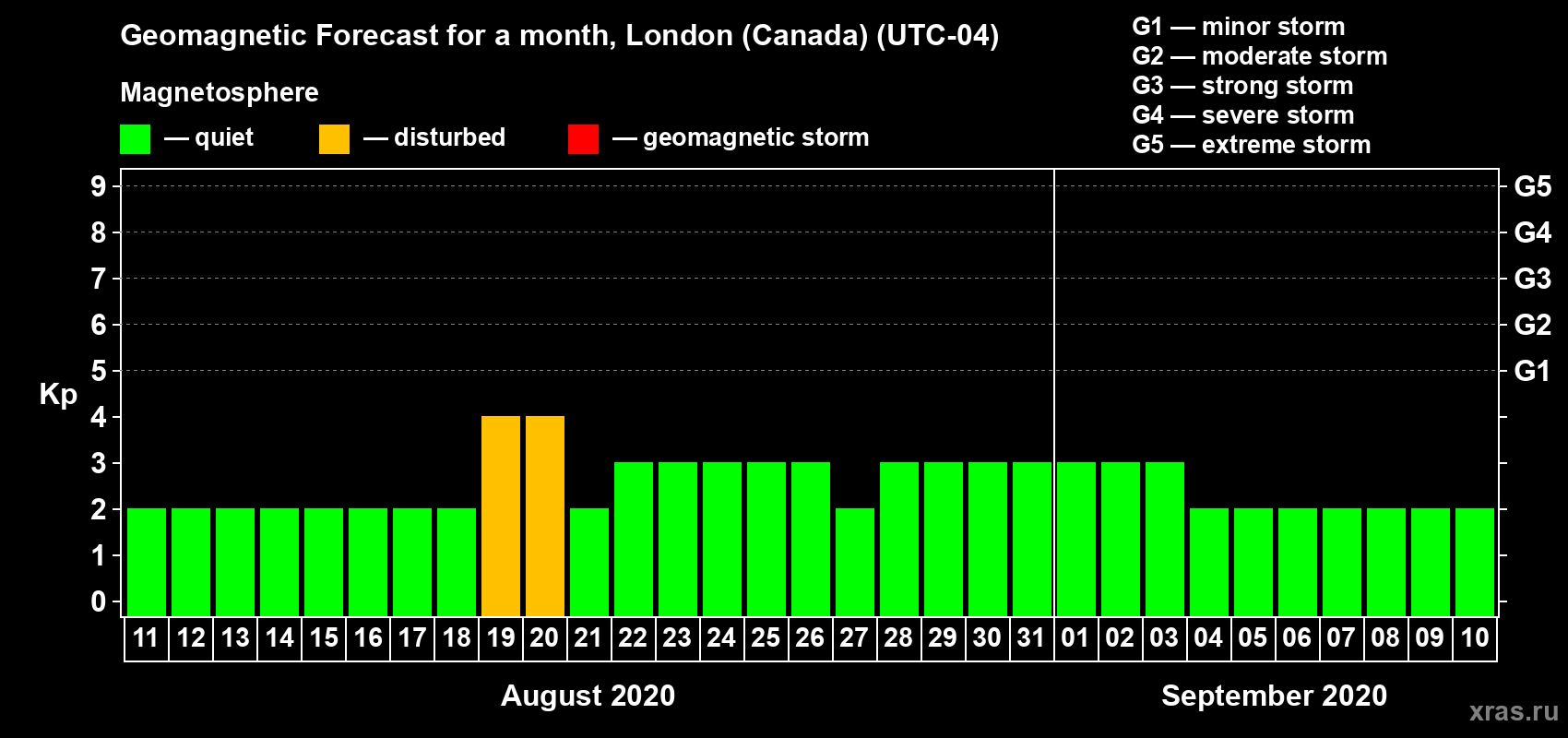 Geomagnetic storm forecast in London (Canada) for Aug 11, 2020