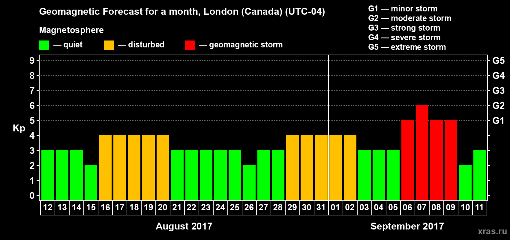 Geomagnetic storm forecast in London (Canada) for Aug 12, 2017