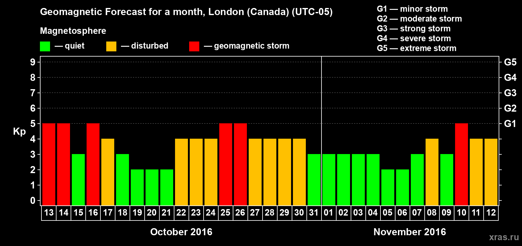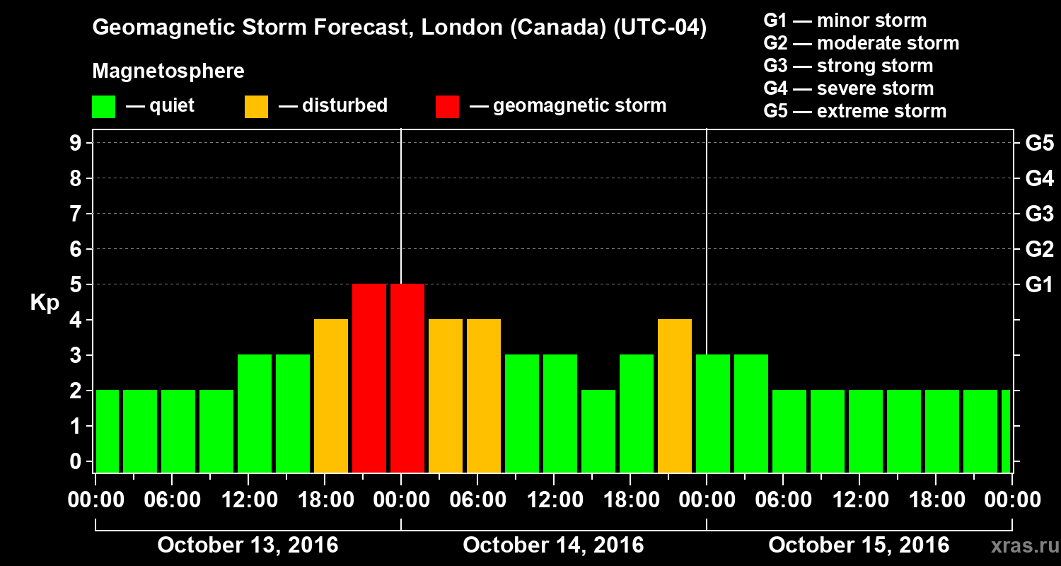 Geomagnetic storm forecast in London (Canada) for Oct 13, 2016