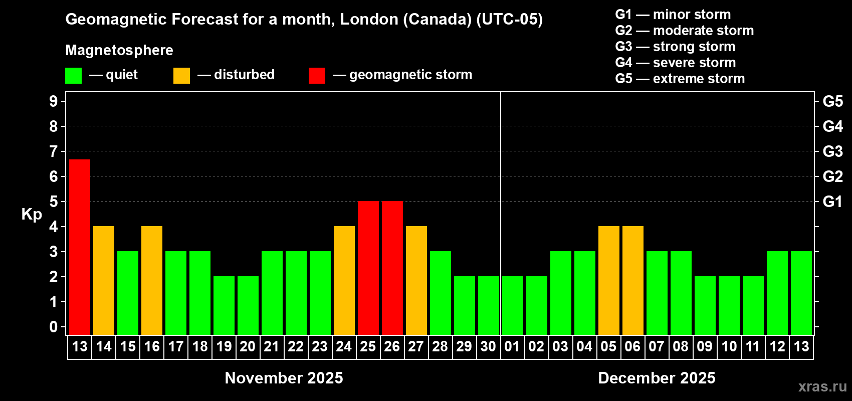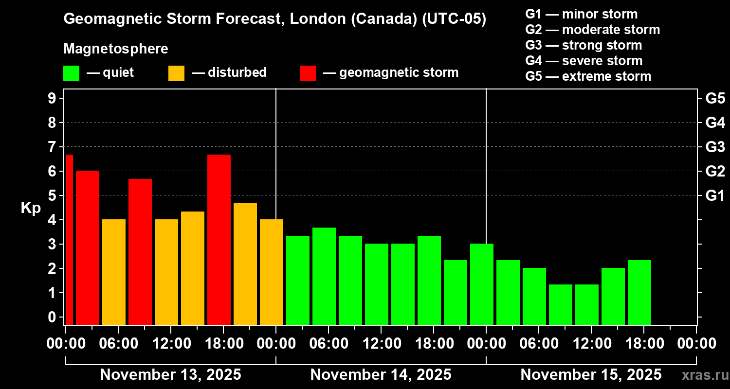 Geomagnetic storm forecast in London (Canada) for Nov 13, 2025