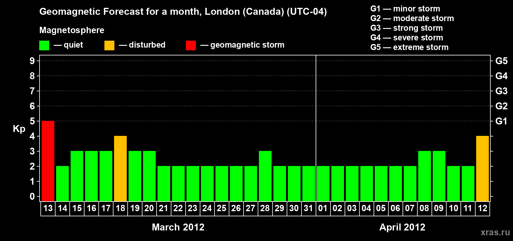 Geomagnetic storm forecast in London (Canada) for Mar 13, 2012