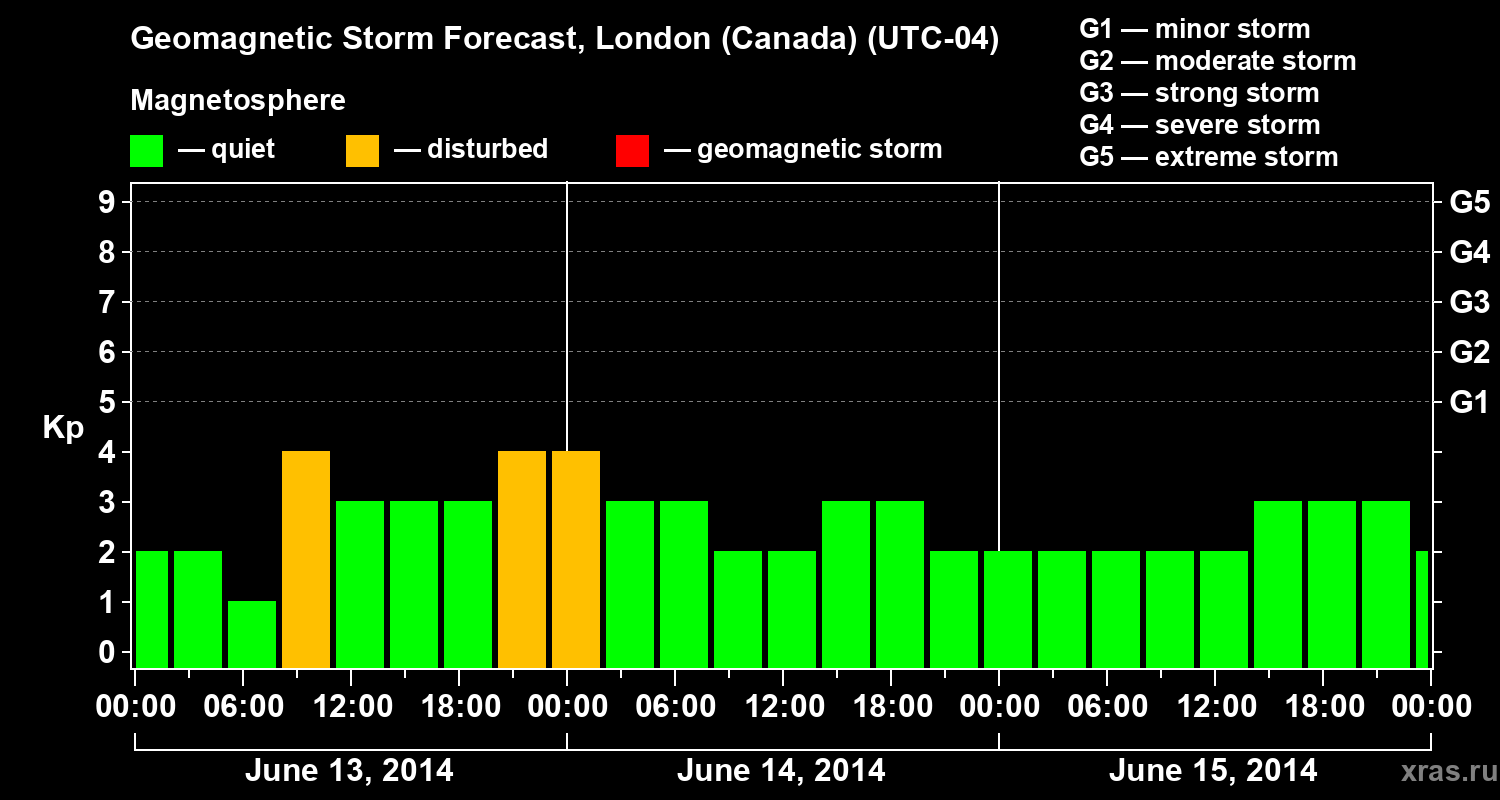 Geomagnetic storm forecast in London (Canada) for Jun 13, 2014