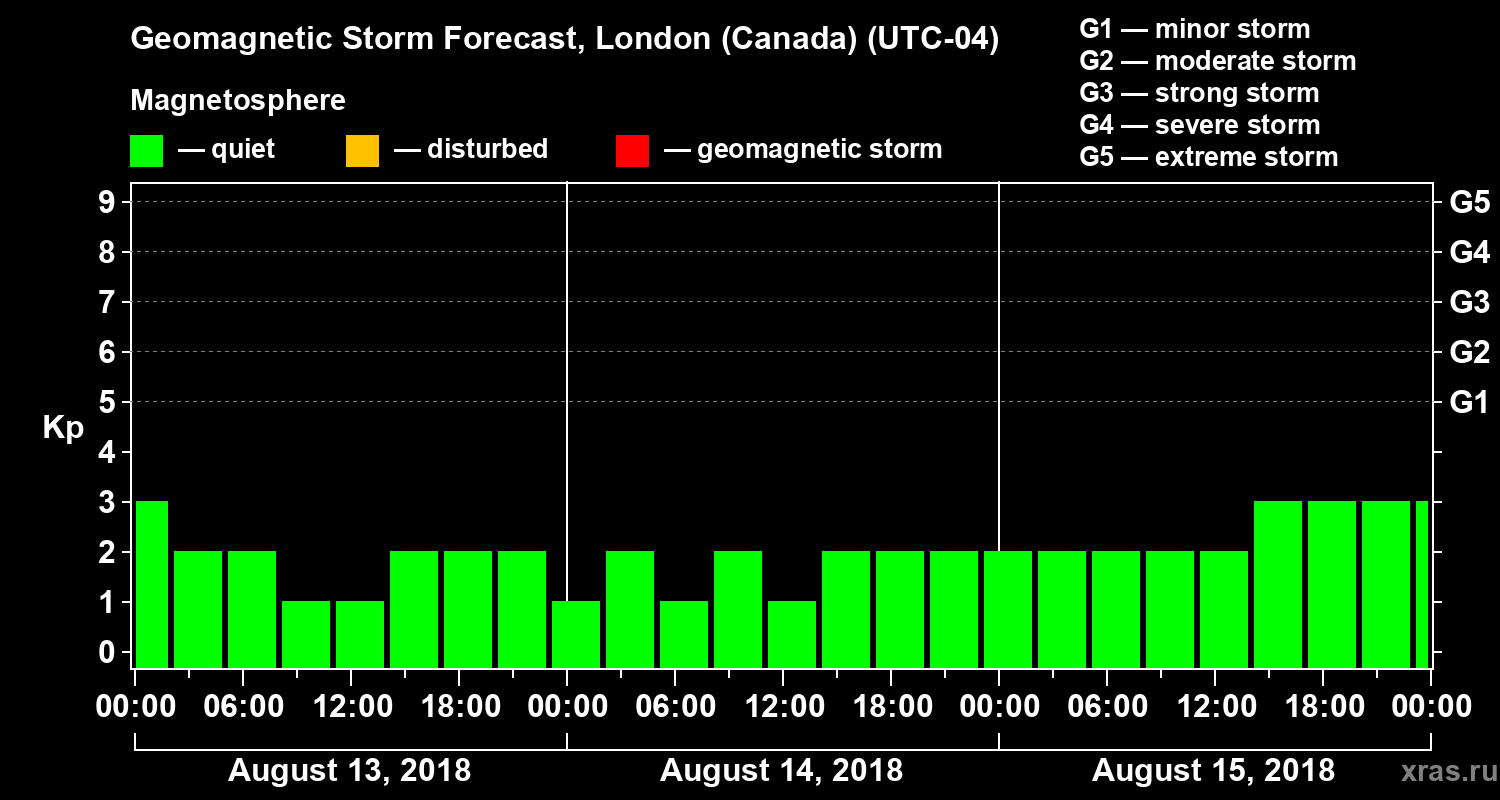 Geomagnetic storm forecast in London (Canada) for Aug 13, 2018