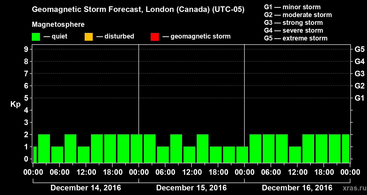 Geomagnetic storm forecast in London (Canada) for Dec 14, 2016